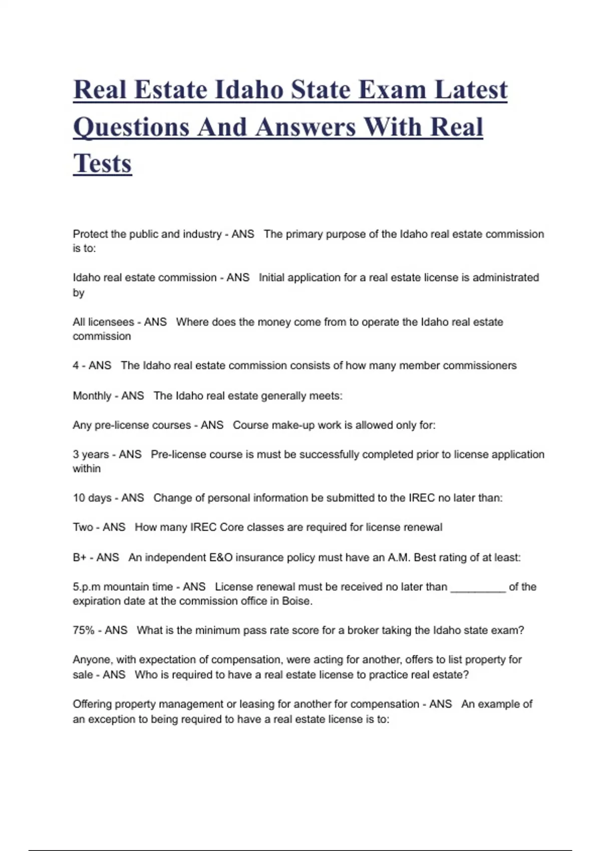 Real Estate Idaho State Exam Latest Questions And Answers With Real Tests