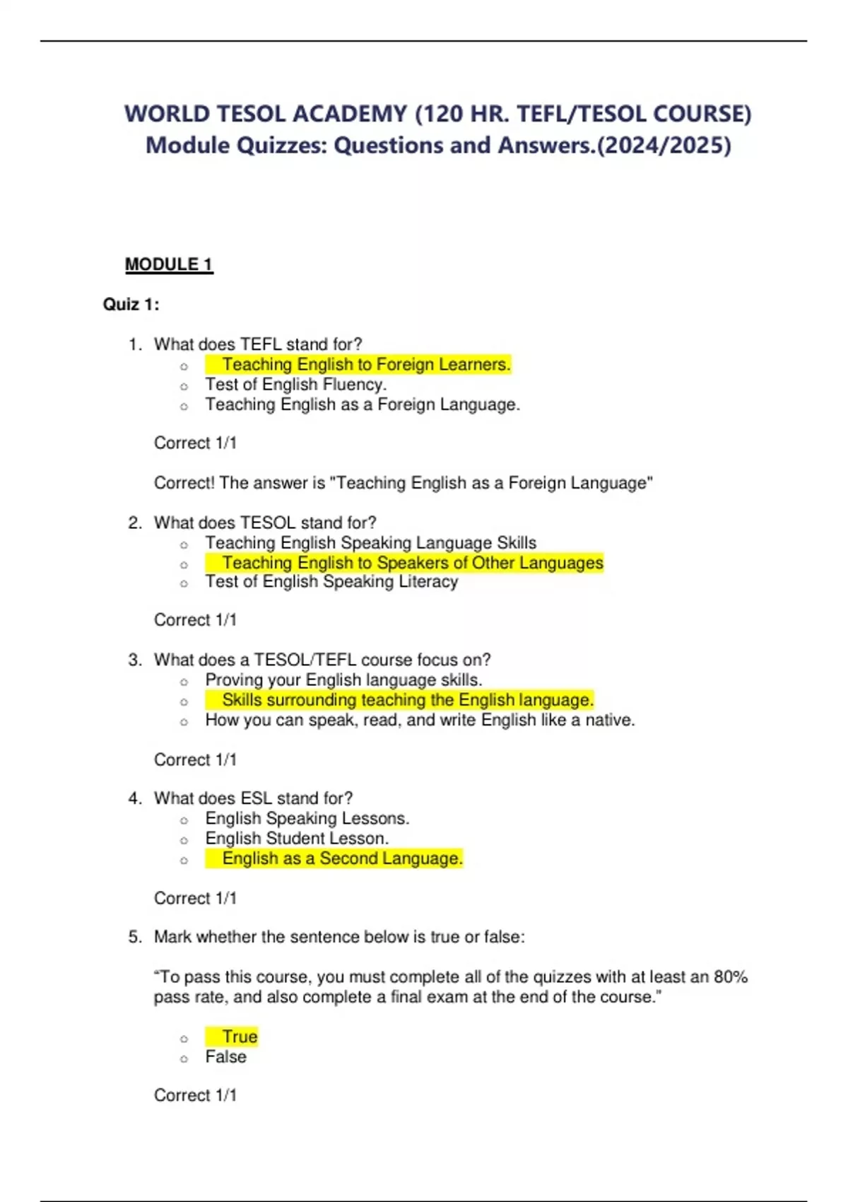WORLD TESOL ACADEMY (120 HR. TEFL/TESOL COURSE) Module Quizzes: Questions and Answers.(2024/2025)