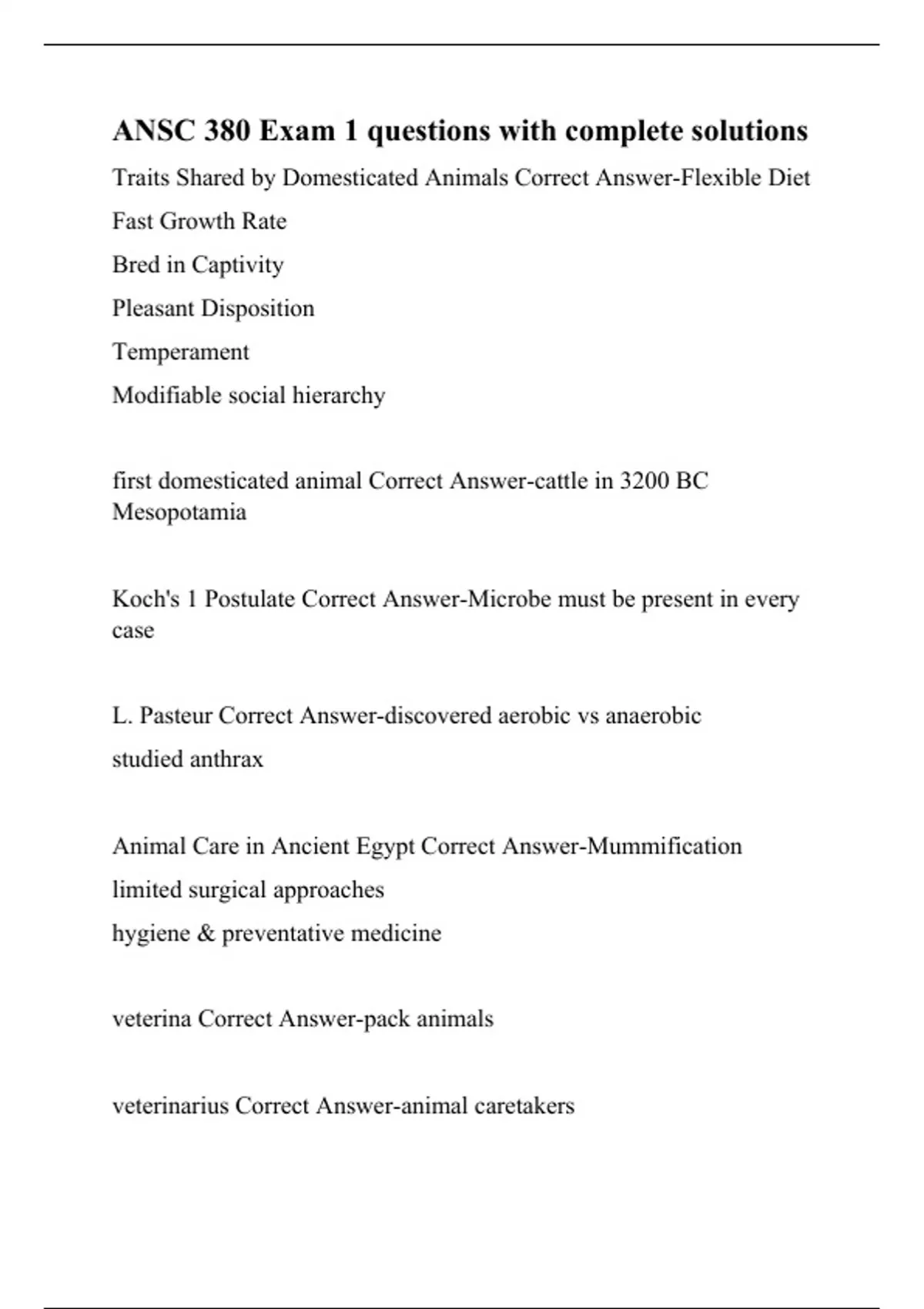 Traits Shared by Domesticated Animals Correct Answer-Flexible Diet Fast Growth Rate Bred in Captivity Pleasant Disposition Temperament Modifiable social hierarchy first domesticated animal Correct Answer-cattle in 3200 BC Mesopotamia Koch's 1 Postulate Correct Answer-Microbe must be present in every case L. Pasteur Correct Answer-discovered aerobic vs anaerobic studied anthrax Animal Care in Ancient Egypt Correct Answer-Mummification limited surgical approaches hygiene & preventative medicine veterina Correct Answer-pack animals