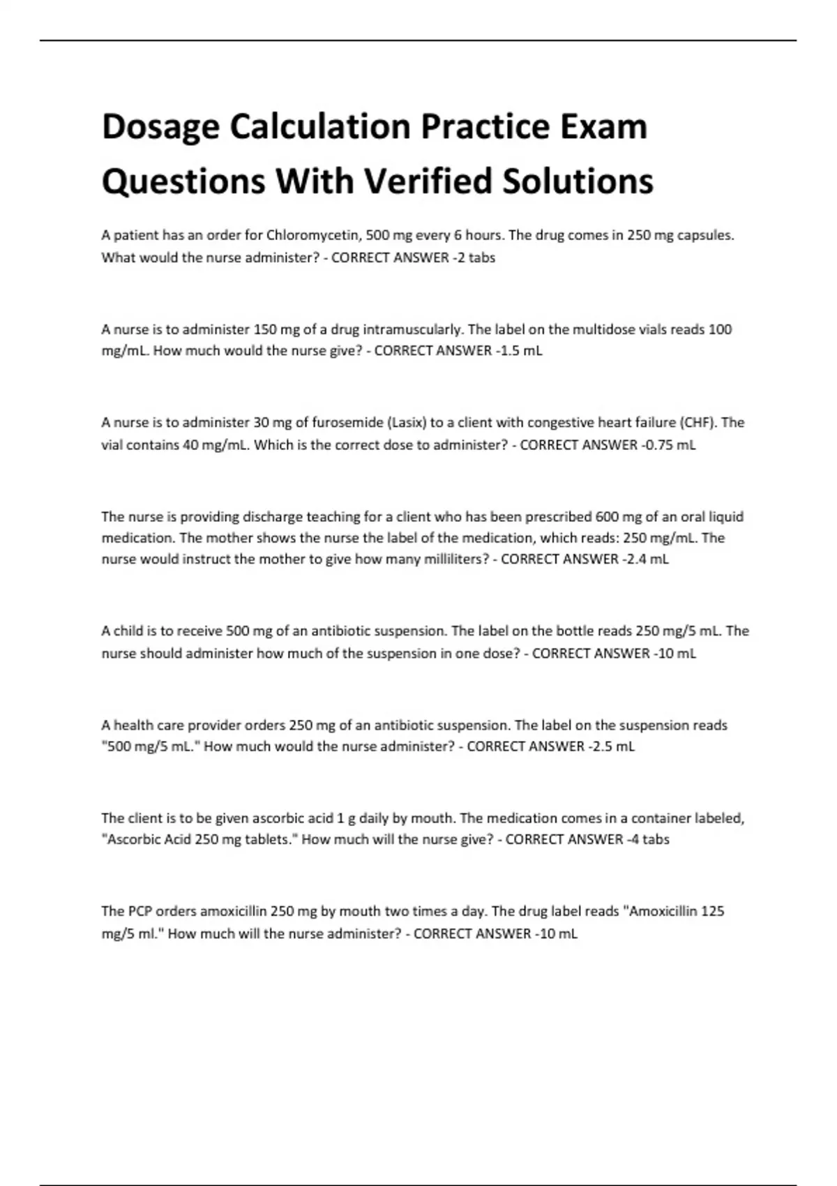 Dosage Calculation Practice Exam Questions With Verified Solutions A patient has an order for Chloromycetin, 500 mg every 6 hours. The drug comes in 250 mg capsules. What would the nurse administer? - CORRECT ANSWER -2 tabs A nurse is to administer 150 mg of a drug intramuscularly. The label on the multidose vials reads 100 mg/mL. How much would the nurse give? - CORRECT ANSWER -1.5 mL A nurse is to administer 30 mg of furosemide (Lasix) to a client with congestive heart failure (CHF). The vial contains 40 mg/mL. Which is the correct dose to administer? - CORRECT ANSWER -0.75 mL The nurse is providing discharge teaching for a client who has been prescribed 600 mg of an oral liquid medication. The mother shows the nurse the label of the medication, which reads: 250 mg/mL. The nurse would instruct the mother to give how many milliliters? - CORRECT ANSWER -2.4 mL A child is to receive 500 mg of an antibiotic suspension. The label on the bottle reads 250 mg/5 mL. The nurse should administer how much of the suspension in one dose? - CORRECT ANSWER -10 mL A health care provider orders 250 mg of an antibiotic suspension. The label on the suspension reads "500 mg/5 mL." How much would the nurse administer? - CORRECT ANSWER -2.5 mL The client is to be given ascorbic acid 1 g daily by mouth. The medication comes in a container labeled, "Ascorbic Acid 250 mg tablets." How much will the nurse give? - CORRECT ANSWER -4 tabs The PCP orders amoxicillin 250 mg by mouth two times a day. The drug label reads "Amoxicillin 125 mg/5 ml." How much will the nurse administer? - CORRECT ANSWER -10 mL