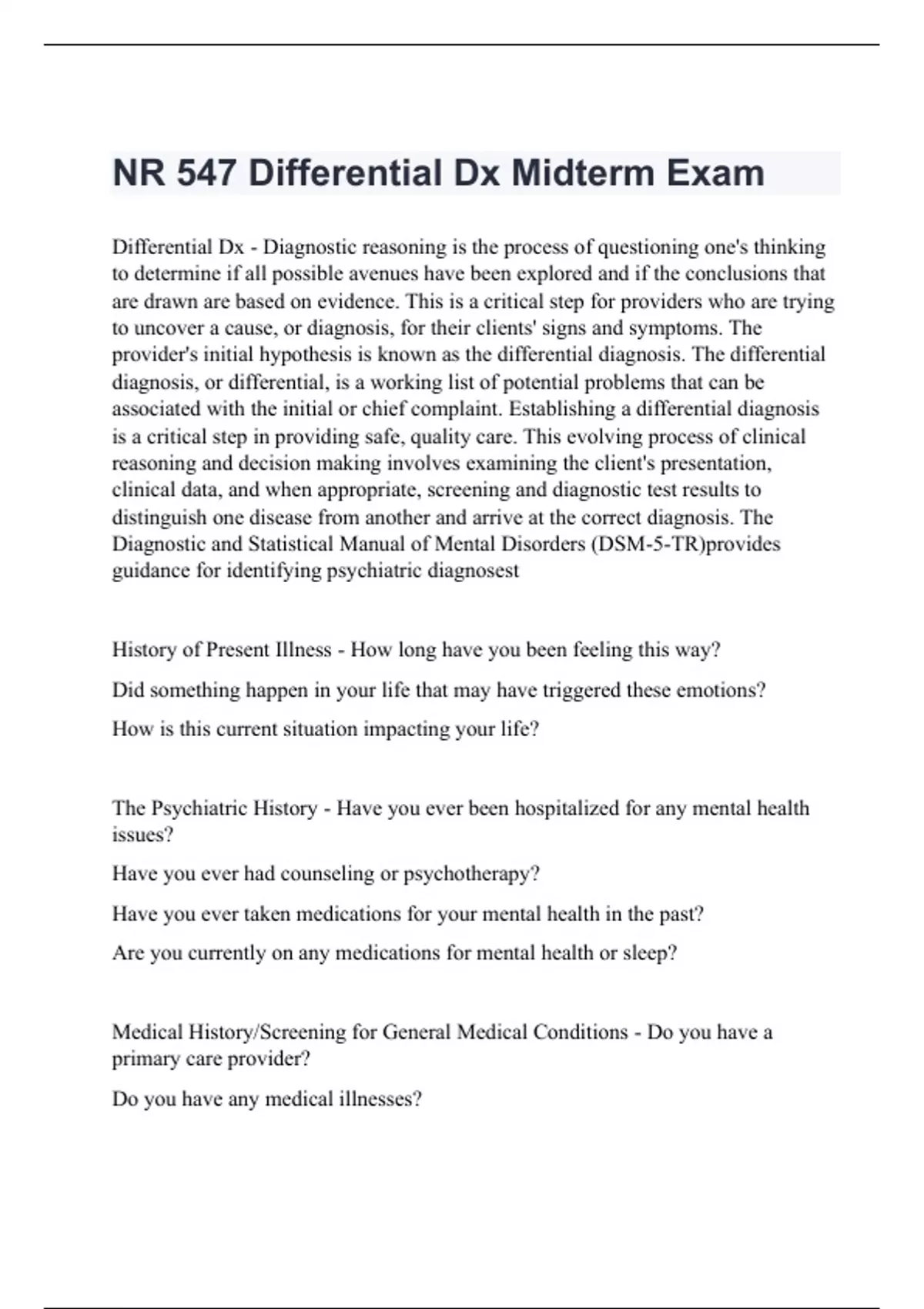 Differential Dx - Diagnostic reasoning is the process of questioning one's thinking to determine if all possible avenues have been explored and if the conclusions that are drawn are based on evidence. This is a critical step for providers who are trying to uncover a cause, or diagnosis, for their clients' signs and symptoms. The provider's initial hypothesis is known as the differential diagnosis. The differential diagnosis, or differential, is a working list of potential problems that can be associated with the initial or chief complaint. Establishing a differential diagnosis is a critical step in providing safe, quality care. This evolving process of clinical reasoning and decision making involves examining the client's presentation, clinical data, and when appropriate, screening and diagnostic test results to distinguish one disease from another and arrive at the correct diagnosis. The Diagnostic and Statistical Manual of Mental Disorders (DSM-5-TR)provides guidance for identifying psychiatric diagnosest History of Present Illness - How long have you been feeling this way? Did something happen in your life that may have triggered these emotions? How is this current situation impacting your life? The Psychiatric History - Have you ever been hospitalized for any mental health issues? Have you ever had counseling or psychotherapy? Have you ever taken medications for your mental health in the past? Are you currently on any medications for mental health or sleep? Medical History/Screening for General Medical Conditions - Do you have a primary care provider? Do you have any medical illnesses? Are you currently taking any medications or herbal supplements? Do you have any allergies to medications? Have you ever been hospitalized for any reason? Have you ever had surgery? Family Psychiatric History - Has any relative of yours ever been hospitalized for a mental health issue? Has any blood relative of yours ever been diagnosed with a mental health issue? Has any blood relative of yours had a history of seizures or dementia/Alzheimer's? Social and Developmental History - Tell me a little bit about your childhood and how you grew up. How was your experience in school when you were younger? Did you enjoy school? How do you support yourself with your finances? Do you have a good support system? Are you currently in a relationship? Where do you live? Who do you live with? What do you do in your free time? What activities do you enjoy? Which of the following should be included when providing client education about medication regimens? Select all that apply. - A)Explain how the medication targets the symptoms, specific benefits, and expected time course. (Correct answer) B)Identify potential side effects, duration of side effects, and adverse effects. (Correct answer) C)Explain the instructions, dosing, and special requirements. (Correct answer) D)Use teach-back methods to ensure client understanding. (Correct answer) Apply the Ask Suicide-Screening Questions (ASQ) Suicide Risk Screening Tool (Links to an external site.) to the scenario below.