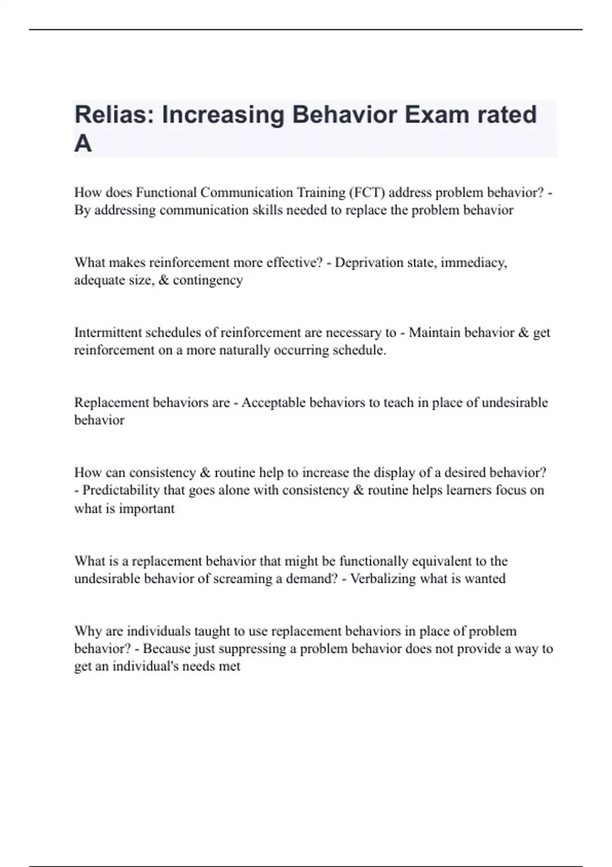 How does Functional Communication Training (FCT) address problem behavior? - By addressing communication skills needed to replace the problem behavior What makes reinforcement more effective? - Deprivation state, immediacy, adequate size, & contingency Intermittent schedules of reinforcement are necessary to - Maintain behavior & get reinforcement on a more naturally occurring schedule. Replacement behaviors are - Acceptable behaviors to teach in place of undesirable behavior How can consistency & routine help to increase the display of a desired behavior? - Predictability that goes alone with consistency & routine helps learners focus on what is important