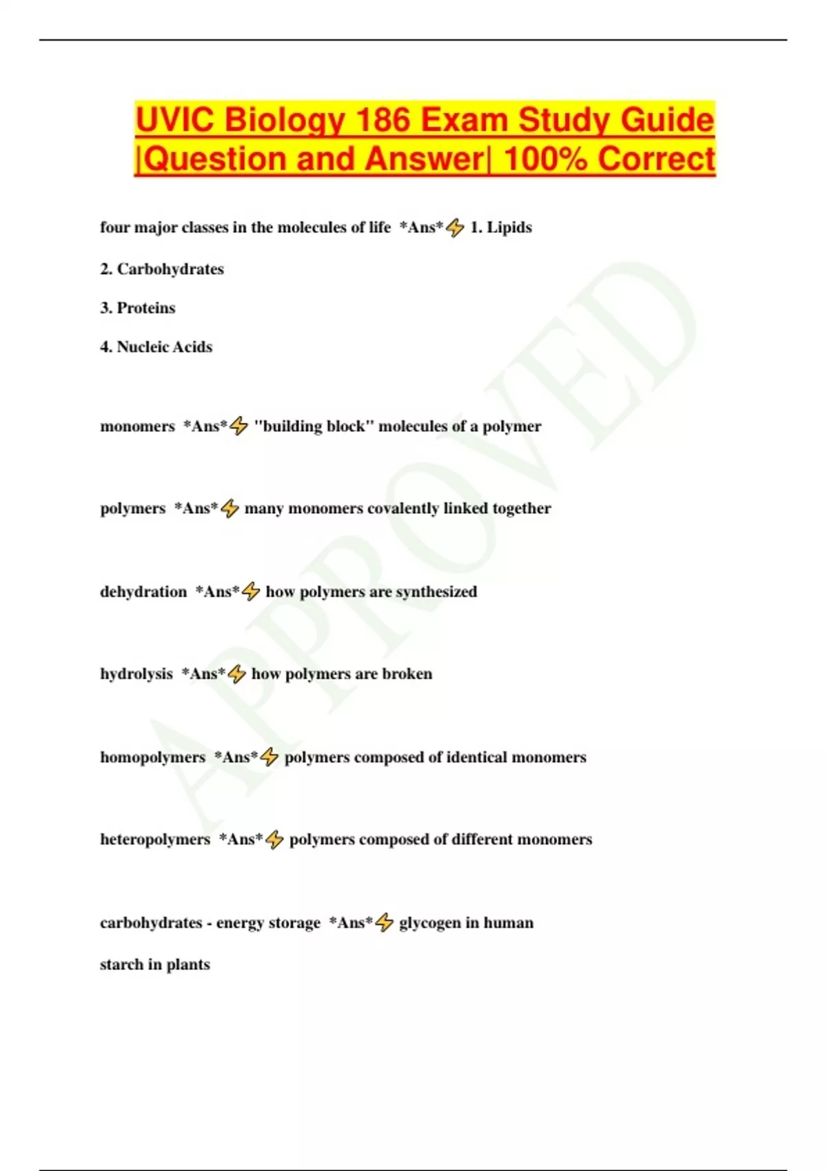 UVIC Biology 186 Exam Study Guide |Question and Answer| 100% Correct four major classes in the molecules of life *Ans* 1. Lipids 2. Carbohydrates 3. Proteins 4. Nucleic Acids monomers *Ans* "building block" molecules of a polymer polymers *Ans* many monomers covalently linked together dehydration *Ans* how polymers are synthesized hydrolysis *Ans* how polymers are broken homopolymers *Ans* polymers composed of identical monomers heteropolymers *Ans* polymers composed of different monomers carbohydrates - energy storage *Ans* glycogen in human starch in plants carbohydrates - energy transport *Ans* glucose in blood sucrose in plants carbohydrates - building material *Ans* chitin in arthropod skeletons cellulose in plants molecular recognition and communication at the cell surface *Ans* membrane glycoproteins and glycolipids, such as the MHC complex on the surface of our cells simple sugar *Ans* 3-7 carbons contain hydroxyl and carbonyl groups eg. glucose, galactose, fructose disaccharides (and oligosaccharides) *Ans* two (or a few) monosaccharides attached together eg. glucose + glucose = maltose glucose + fructose = sucrose cellulose *Ans* principle component of plant cell walls glucose linkage: β(1-->4)