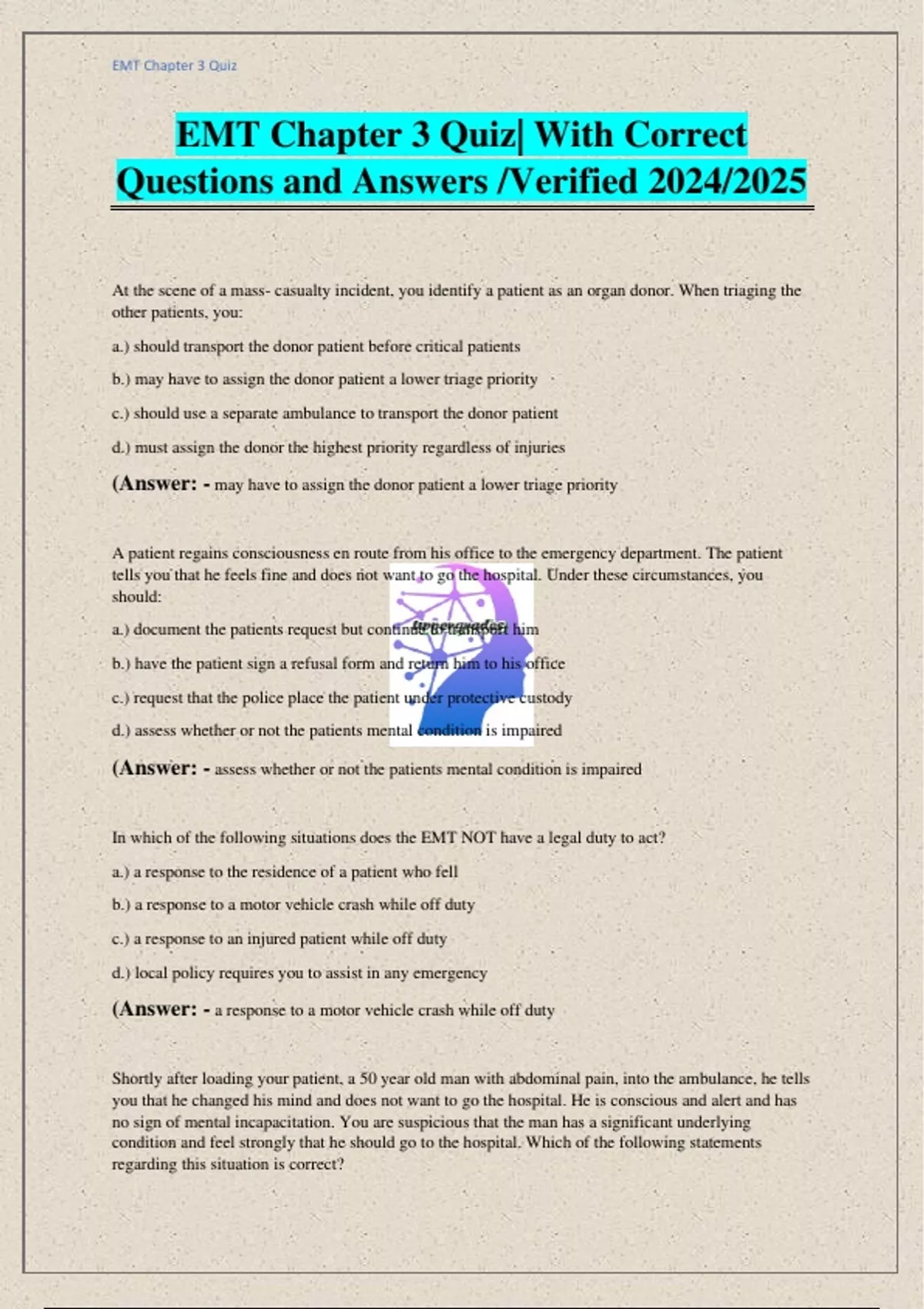 EMT Chapter 3 Quiz| With Correct Questions and Answers /Verified 2024/2025