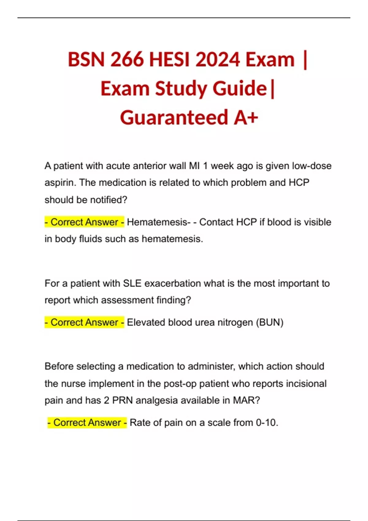 BSN 266 HESI 2024 Exam | Exam Study Guide| Guaranteed A+ BSN 266 HESI 2024 Exam | Exam Study Guide| Guaranteed A+ BSN 266 HESI 2024 Exam | Exam Study Guide| Guaranteed A+