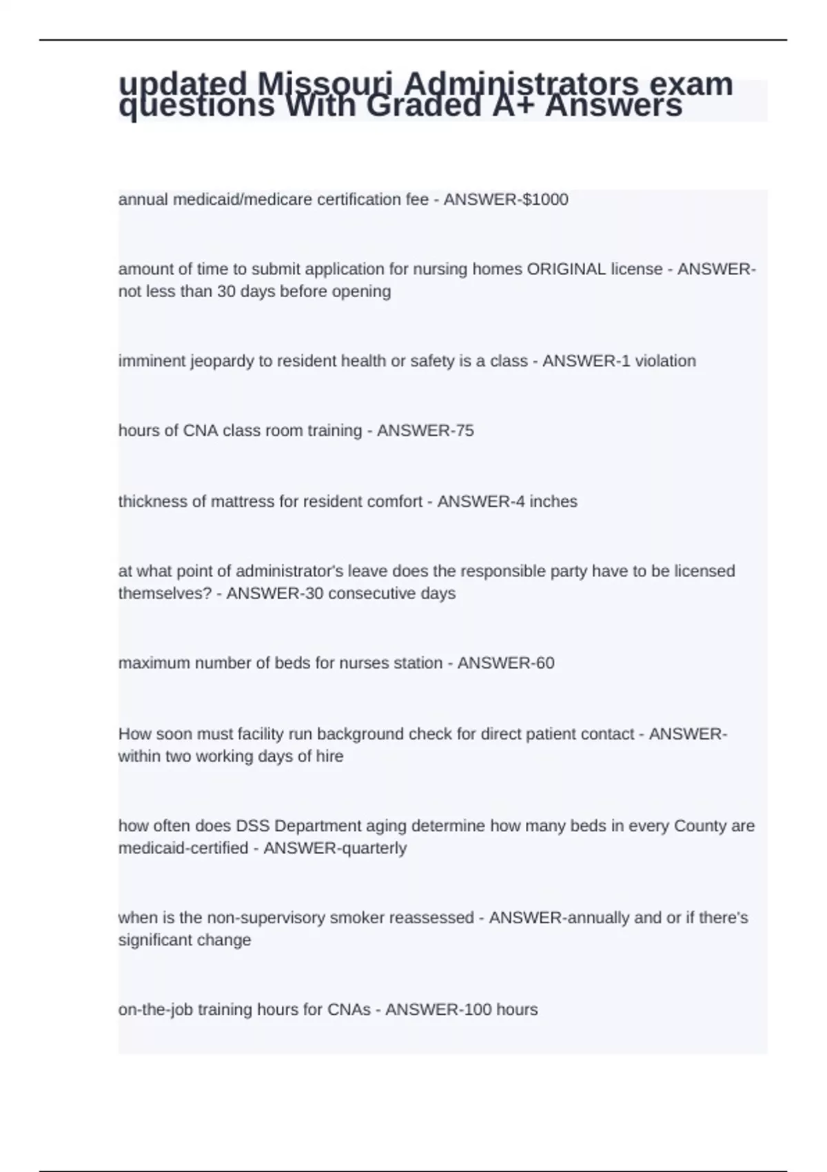 annual medicaid/medicare certification fee - ANSWER-$1000 amount of time to submit application for nursing homes ORIGINAL license - ANSWER-not less than 30 days before opening imminent jeopardy to resident health or safety is a class - ANSWER-1 violation hours of CNA class room training - ANSWER-75 thickness of mattress for resident comfort - ANSWER-4 inches at what point of administrator's leave does the responsible party have to be licensed themselves? - ANSWER-30 consecutive days maximum number of beds for nurses station - ANSWER-60 How soon must facility run background check for direct patient contact - ANSWER-within two working days of hire how often does DSS Department aging determine how many beds in every County are medicaid-certified - ANSWER-quarterly when is the non-supervisory smoker reassessed - ANSWER-annually and or if there's significant change