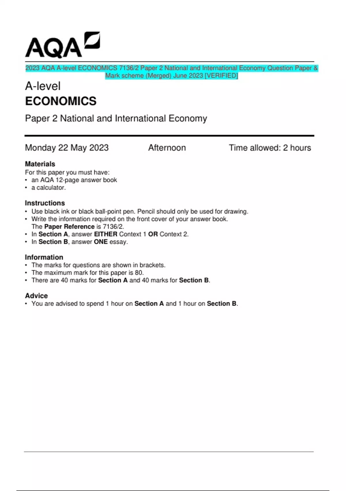 2023 AQA A-level ECONOMICS 7136/2 Paper 2 National and International Economy Question Paper & Mark scheme (Merged) June 2023 [VERIFIED]