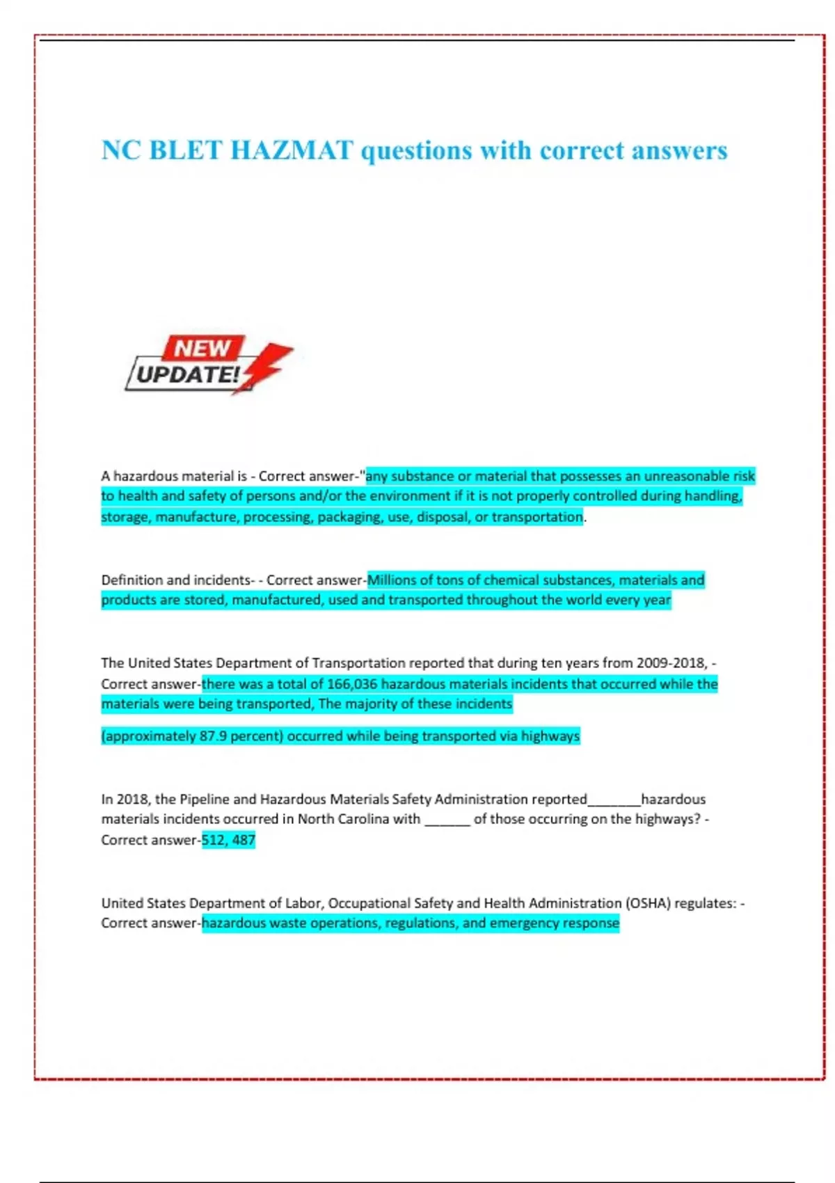 A hazardous material is - Correct answer-"any substance or material that possesses an unreasonable risk to health and safety of persons and/or the environment if it is not properly controlled during handling, storage, manufacture, processing, packaging, use, disposal, or transportation. Definition and incidents- - Correct answer-Millions of tons of chemical substances, materials and products are stored, manufactured, used and transported throughout the world every year The United States Department of Transportation reported that during ten years from , - Correct answer-there was a total of 166,036 hazardous materials incidents that occurred while the materials were being transported, The majority of these incidents (approximately 87.9 percent) occurred while being transported via highways