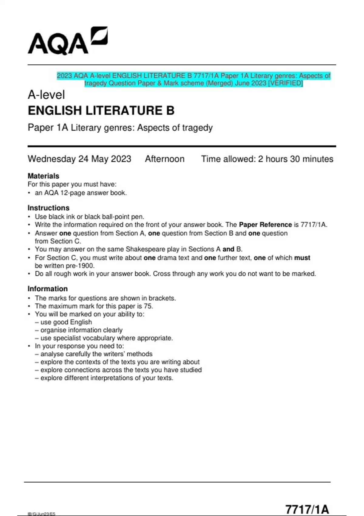 2023 AQA A-level ENGLISH LITERATURE B 7717/1A Paper 1A Literary genres: Aspects of tragedy Question Paper & Mark scheme (Merged) June 2023 [VERIFIED]