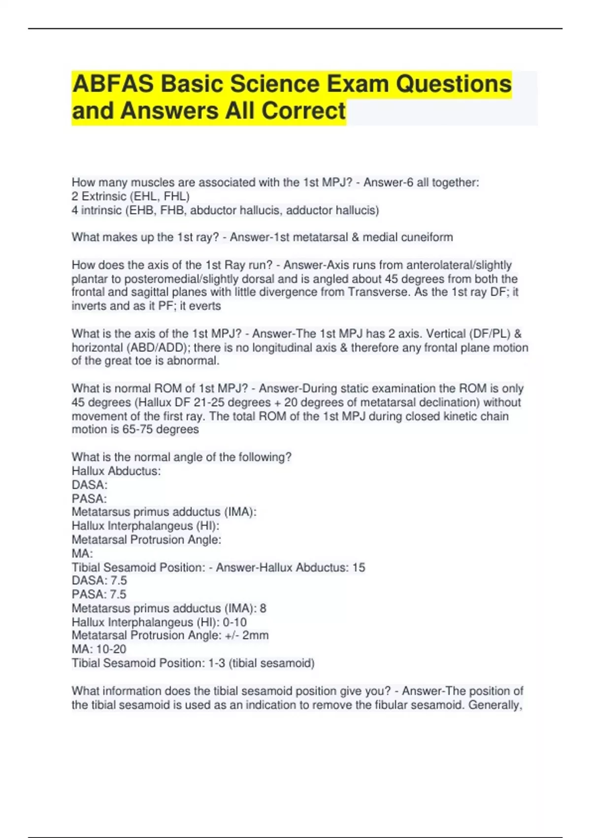 ABFAS Basic Science Exam Questions and Answers All Correct How many muscles are associated with the 1st MPJ? - Answer-6 all together: 2 Extrinsic (EHL, FHL) 4 intrinsic (EHB, FHB, abductor hallucis, adductor hallucis) What makes up the 1st ray? - Answer-1st metatarsal & medial cuneiform How does the axis of the 1st Ray run? - Answer-Axis runs from anterolateral/slightly plantar to posteromedial/slightly dorsal and is angled about 45 degrees from both the frontal and sagittal planes with little divergence from Transverse. As the 1st ray DF; it inverts and as it PF; it everts What is the axis of the 1st MPJ? - Answer-The 1st MPJ has 2 axis. Vertical (DF/PL) & horizontal (ABD/ADD); there is no longitudinal axis & therefore any frontal plane motion of the great toe is abnormal. What is normal ROM of 1st MPJ? - Answer-During static examination the ROM is only 45 degrees (Hallux DF 21-25 degrees + 20 degrees of metatarsal declination) without movement of the first ray. The total ROM of the 1st MPJ during closed kinetic chain motion is 65-75 degrees What is the normal angle of the following? Hallux Abductus: DASA: PASA: Metatarsus primus adductus (IMA): Hallux Interphalangeus (HI): Metatarsal Protrusion Angle: MA: Tibial Sesamoid Position: - Answer-Hallux Abductus: 15 DASA: 7.5 PASA: 7.5 Metatarsus primus adductus (IMA): 8 Hallux Interphalangeus (HI): 0-10 Metatarsal Protrusion Angle: +/- 2mm MA: 10-20 Tibial Sesamoid Position: 1-3 (tibial sesamoid) What information does the tibial sesamoid position give you? - Answer-The position of the tibial sesamoid is used as an indication to remove the fibular sesamoid. Generally, the fibular sesamoid should be removed when the tibial sesamoid is in a position of 4 or more. In this position, the sesamoid is resting on or over the crista of the first metatarsal and thus is usually eroded What shape of the metatarsal head is the most stable? - Answer-When the metatarsal head is square with a ridge it is the most stable vs. round shape which is the most unstable What are the 5 normal first ray essentials - Answer-1. Supinated position of the foot in propulsion 2. Normal metatarsal length pattern (2 longer than 3) 3. Normal strength & phasic activity of muscles 4. Normal sesamoid apparatus 5. Stable base of the proximal phalanx What is the most common etiology for HAV deformity? - Answer-Hypermobility of the 1st ray secondary to subtalar joint pronation or ligament laxity What are other etiologies of HAV deformity - Answer-1. Metatarsal deviation caused by asymmetric growth of the met base 2. Metatarsus primus varus 20 degrees (line bisecting 1st met with medial cuneiform) 3. Relative metatarsal protrusion length 4. Rotational deformities (i.e. internal rotation of hip, femur, knee, tibia or foot) 5. Inflammatory joint disease What is the definition of a Congruous 1st MPJ - Answer-The head of the first metatarsal completely articulates with the base of the proximal phalanx and that the joint space is equal. The line bisecting the 1st met and proximal phalanx are parallel What is the definition of a Deviated 1st MPJ - Answer-An abductus of the hallux within the joint. The base is not displaced off of the head; however, the medial aspect of the head is exposed. The joint space is no longer equal throughout. The lines intersect outside of the joint What is the definition of a Subluxed 1st MPJ - Answer-An abductus of the hallux within the joint. The base of the proximal phalanx does not completely articulate with the metatarsal head. The medial aspect of the head is very much exposed and the joint space is no longer equal. The lines intersect within the joint What is a structural bunion deformity? - Answer-It's when the PASA + DASA = HAA. The joint in this type of deformity is CONGRUENT. The PASA or DASA in this case are abnormal
