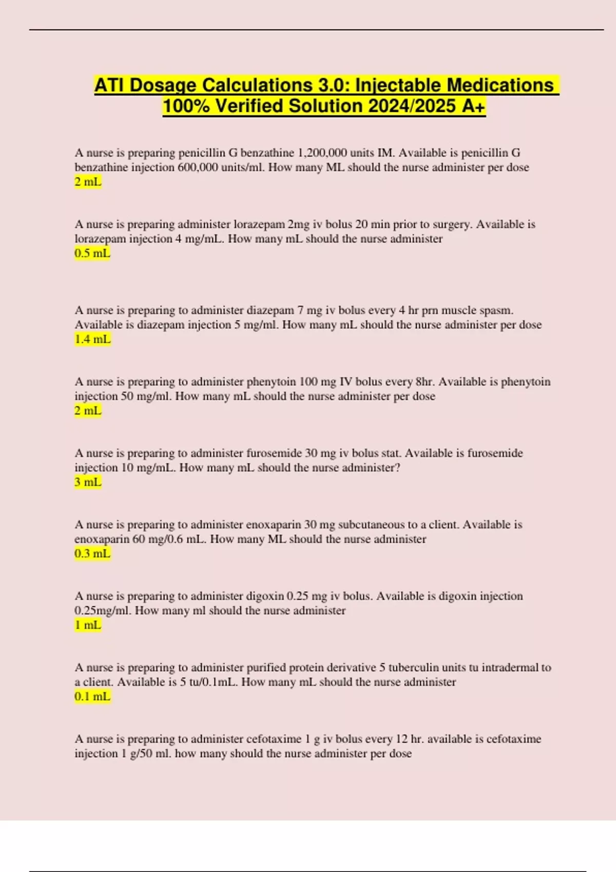 ATI Dosage Calculations 3.0: Injectable Medications 100% Verified Solution 2024/2025 A+ A nurse is preparing penicillin G benzathine 1,200,000 units IM. Available is penicillin G benzathine injection 600,000 units/ml. How many ML should the nurse administer per dose 2 mL A nurse is preparing administer lorazepam 2mg iv bolus 20 min prior to surgery. Available is lorazepam injection 4 mg/mL. How many mL should the nurse administer 0.5 mL A nurse is preparing to administer diazepam 7 mg iv bolus every 4 hr prn muscle spasm. Available is diazepam injection 5 mg/ml. How many mL should the nurse administer per dose 1.4 mL A nurse is preparing to administer phenytoin 100 mg IV bolus every 8hr. Available is phenytoin injection 50 mg/ml. How many mL should the nurse administer per dose 2 mL A nurse is preparing to administer furosemide 30 mg iv bolus stat. Available is furosemide injection 10 mg/mL. How many mL should the nurse administer? 3 mL A nurse is preparing to administer enoxaparin 30 mg subcutaneous to a client. Available is enoxaparin 60 mg/0.6 mL. How many ML should the nurse administer... Continues...