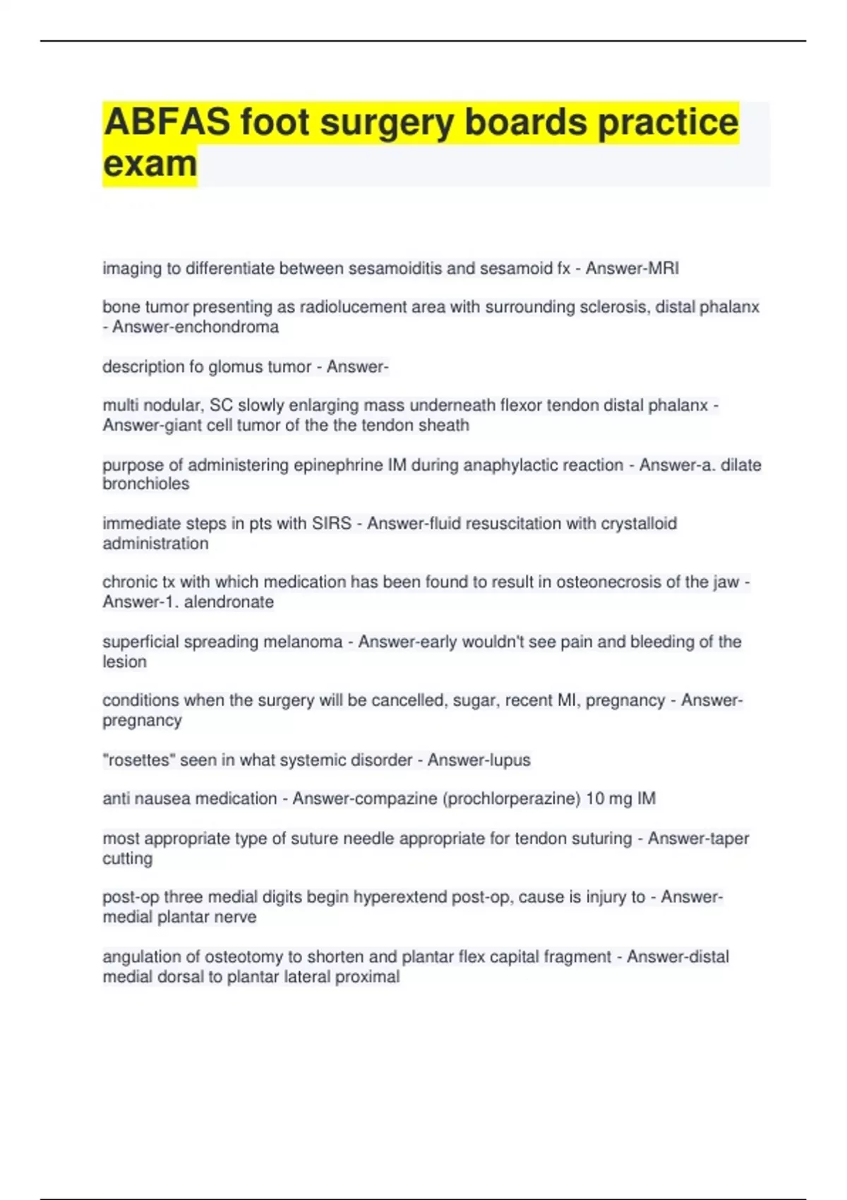 ABFAS foot surgery boards practice exam imaging to differentiate between sesamoiditis and sesamoid fx - Answer-MRI bone tumor presenting as radiolucement area with surrounding sclerosis, distal phalanx - Answer-enchondroma description fo glomus tumor - Answer- multi nodular, SC slowly enlarging mass underneath flexor tendon distal phalanx - Answer-giant cell tumor of the the tendon sheath purpose of administering epinephrine IM during anaphylactic reaction - Answer-a. dilate bronchioles immediate steps in pts with SIRS - Answer-fluid resuscitation with crystalloid administration chronic tx with which medication has been found to result in osteonecrosis of the jaw - Answer-1. alendronate superficial spreading melanoma - Answer-early wouldn't see pain and bleeding of the lesion conditions when the surgery will be cancelled, sugar, recent MI, pregnancy - Answer- pregnancy "rosettes" seen in what systemic disorder - Answer-lupus anti nausea medication - Answer-compazine (prochlorperazine) 10 mg IM most appropriate type of suture needle appropriate for tendon suturing - Answer-taper cutting post-op three medial digits begin hyperextend post-op, cause is injury to - Answer- medial plantar nerve angulation of osteotomy to shorten and plantar flex capital fragment - Answer-distal medial dorsal to plantar lateral proximal Z skin plasty procedure description - Answer-make central incision of the Z parallel to the contracted skin surgical sutures from most to least reactive list - Answer-monofilament wir lease reactive reason for holding metformin 24 hrs pre-op - Answer-hypoglycemia most appropriate to repair Jone's 5th met fx - Answer-IM screw most appropriate imaging to diagnose OM 3 weeks post-op chevron osteotomy - Answer-WBC scan most appropriate treatment of CN coalition in a 20 yo athlete - Answer-- resection with muscle transposition most beneficial repair of stage 4 hallux limits in an active patient - Answer-arthrodesis of 1st MT CNF joint 60 degrees lengthening of the Z plasty would provide - Answer-75% lengthening popliteal artery branches off - Answer-superficial femoral artery HPK sub 2nd met head most likely etiology - Answer-hypermobile 1st ray shortened and df met axis placement - Answer-plantamedial distal to dorsolateral proximal brachymet ex fix start turning - Answer-7 days post op hx of DVT, post lapidus procedure dvt prophylaxis - Answer-Low weight heparin until WB rd digit drifting into adducted position which structure was injured - Answer-3rd dorsal interossei