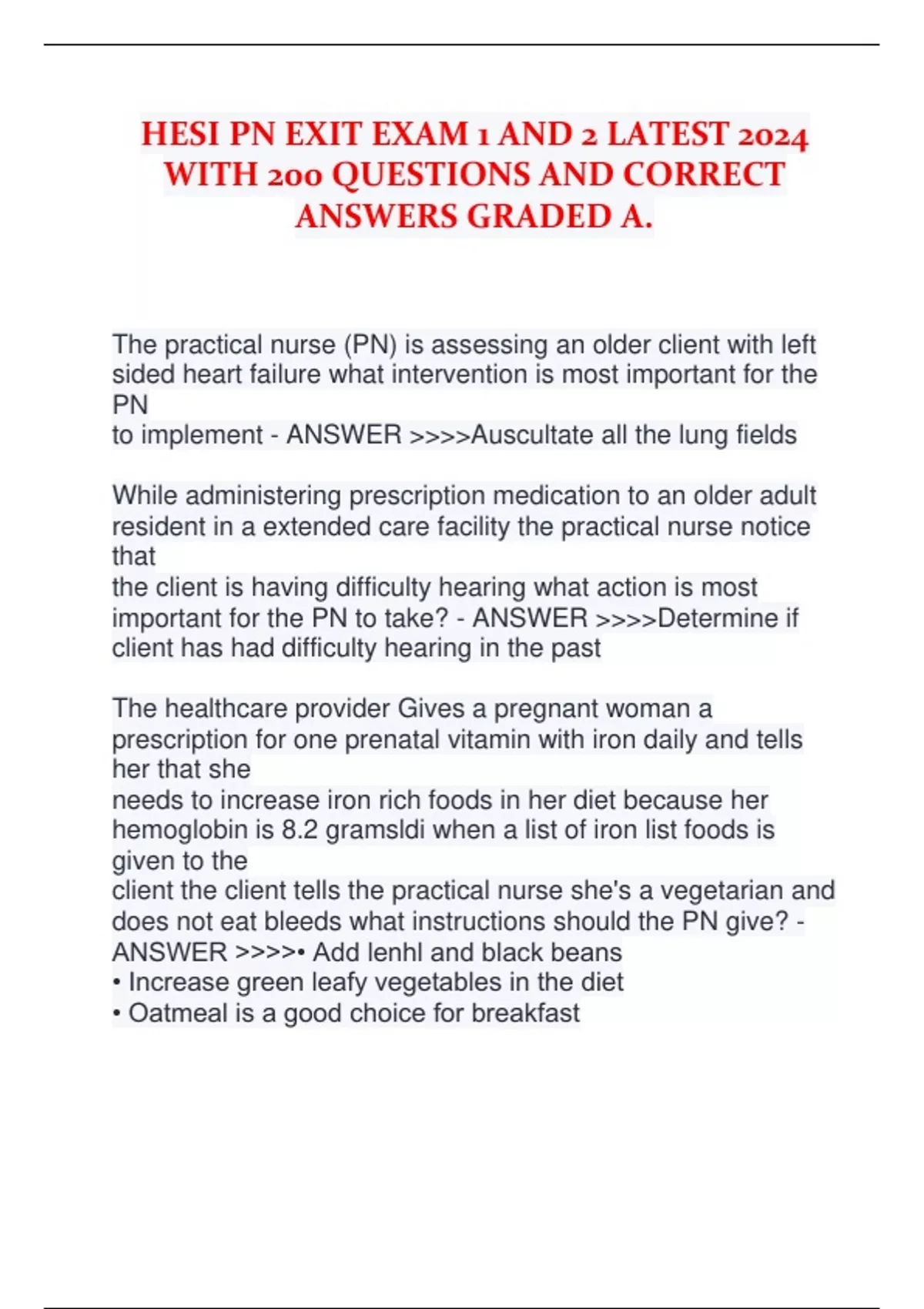 HESI PN EXIT EXAM 1 AND 2 LATEST 2024 WITH 200 QUESTIONS AND CORRECT ANSWERS GRADED A.
