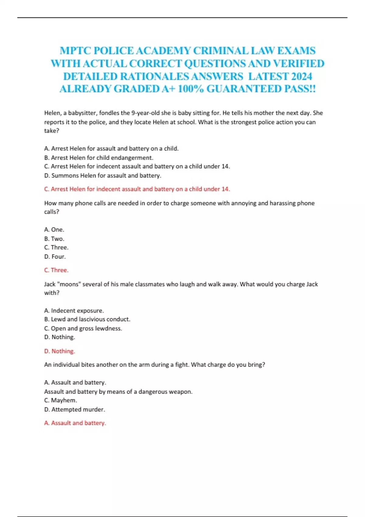 MPTC POLICE ACADEMY CRIMINAL LAW EXAMS WITH ACTUAL CORRECT QUESTIONS AND VERIFIED DETAILED RATIONALES ANSWERS LATEST 2024 ALREADY GRADED A+ 100% GUARANTEED PASS!!