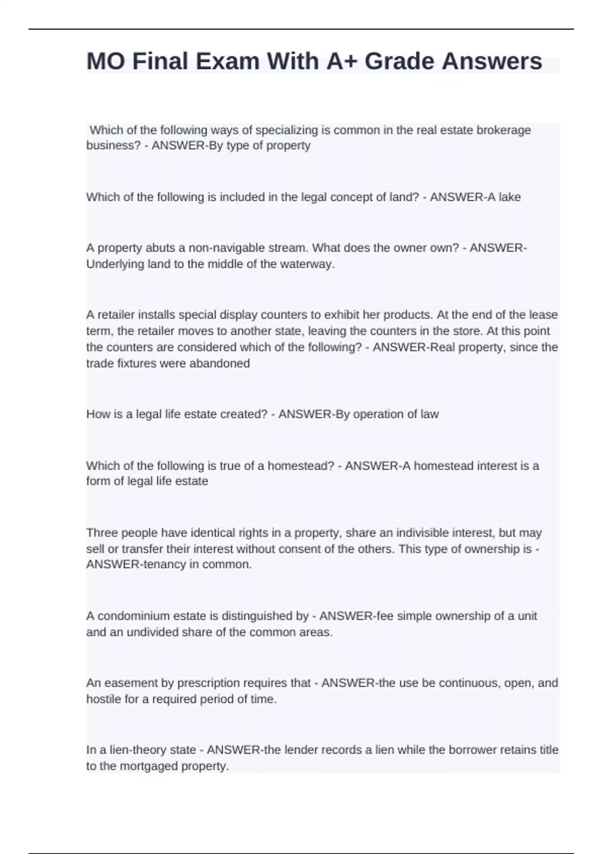 Which of the following ways of specializing is common in the real estate brokerage business? - ANSWER-By type of property Which of the following is included in the legal concept of land? - ANSWER-A lake A property abuts a non-navigable stream. What does the owner own? - ANSWER-Underlying land to the middle of the waterway. A retailer installs special display counters to exhibit her products. At the end of the lease term, the retailer moves to another state, leaving the counters in the store. At this point the counters are considered which of the following? - ANSWER-Real property, since the trade fixtures were abandoned How is a legal life estate created? - ANSWER-By operation of law Which of the following is true of a homestead? - ANSWER-A homestead interest is a form of legal life estate Three people have identical rights in a property, share an indivisible interest, but may sell or transfer their interest without consent of the others. This type of ownership is - ANSWER-tenancy in common. A condominium estate is distinguished by - ANSWER-fee simple ownership of a unit and an undivided share of the common areas. An easement by prescription requires that - ANSWER-the use be continuous, open, and hostile for a required period of time. In a lien-theory state - ANSWER-the lender records a lien while the borrower retains title to the mortgaged property. Five liens have been recorded against a certain house, in the following order: first mortgage, mechanic's lien, second mortgage, real estate tax lien, special assessment lien. Which lien will be the last one to be paid from the proceeds of the sale of the house? - ANSWER-Second mortgage lien For a conveyance by deed between private parties to be valid, the deed must be - ANSWER-accepted by the grantee. If a person dies with legal heirs and has left no valid will, what happens to real property owned by that person? - ANSWER-It is probated and passes to the heirs by laws of descent. A miner openly lives and prospects on a 20,000-acre ranch. After twenty years, the owner notices the miner and kicks him off the property. The miner makes a claim of ownership to the property. This claim will likely be - ANSWER-upheld, because the possession was not concealed.