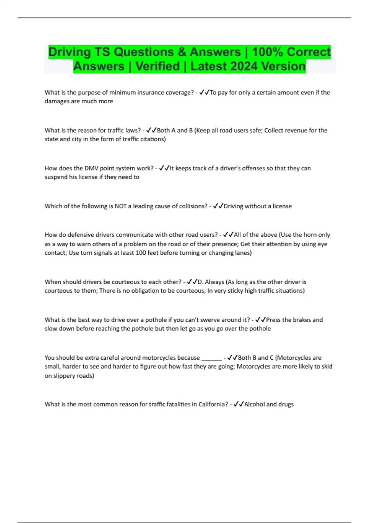 Driving TS Questions & Answers | 100% Correct Answers | Verified | Latest 2024 Version