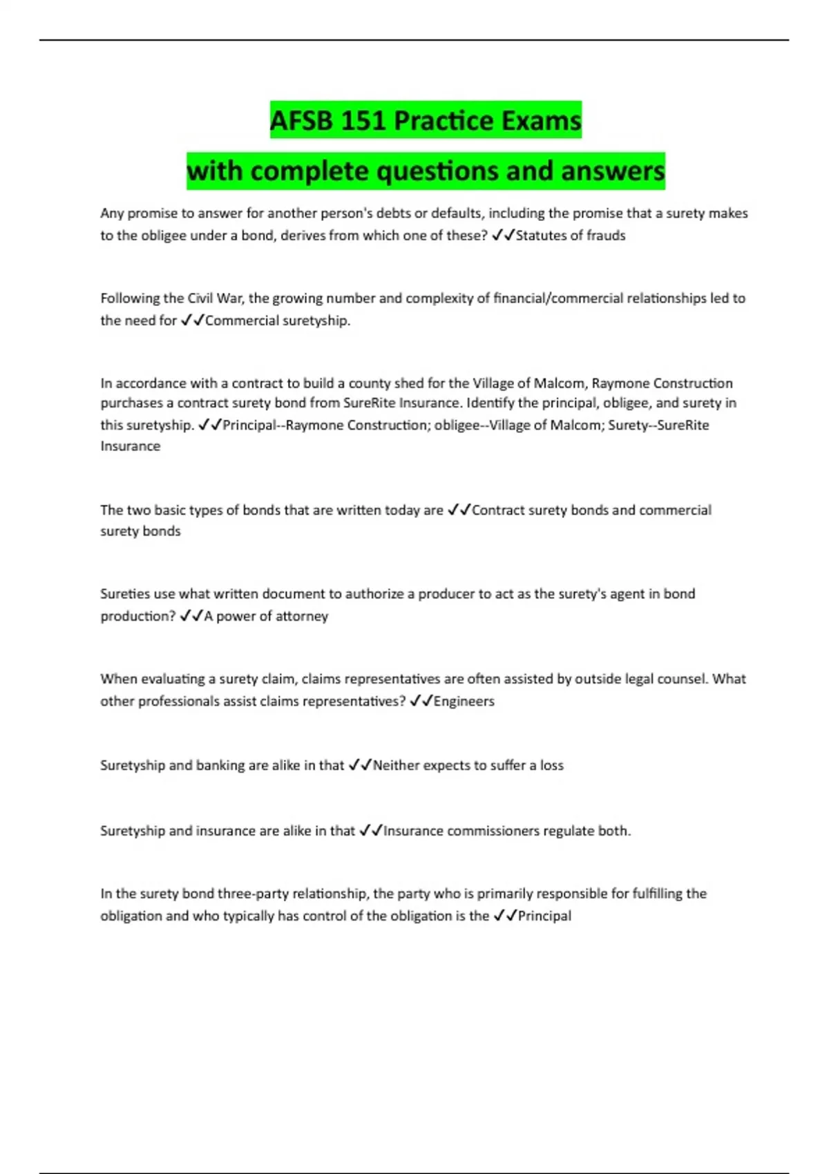 Any promise to answer for another person's debts or defaults, including the promise that a surety makes to the obligee under a bond, derives from which one of these? Statutes of frauds Following the Civil War, the growing number and complexity of financial/commercial relationships led to the need for Commercial suretyship. In accordance with a contract to build a county shed for the Village of Malcom, Raymone Construction purchases a contract surety bond from SureRite Insurance. Identify the principal, obligee, and surety in this suretyship. Principal--Raymone Construction; obligee--Village of Malcom; Surety--SureRite Insurance The two basic types of bonds that are written today are Contract surety bonds and commercial surety bonds Sureties use what written document to authorize a producer to act as the surety's agent in bond production? A power of attorney When evaluating a surety claim, claims representatives are often assisted by outside legal counsel. What other professionals assist claims representatives? Engineers Suretyship and banking are alike in that Neither expects to suffer a loss Suretyship and insurance are alike in that Insurance commissioners regulate both. In the surety bond three-party relationship, the party who is primarily responsible for fulfilling the obligation and who typically has control of the obligation is the Principa