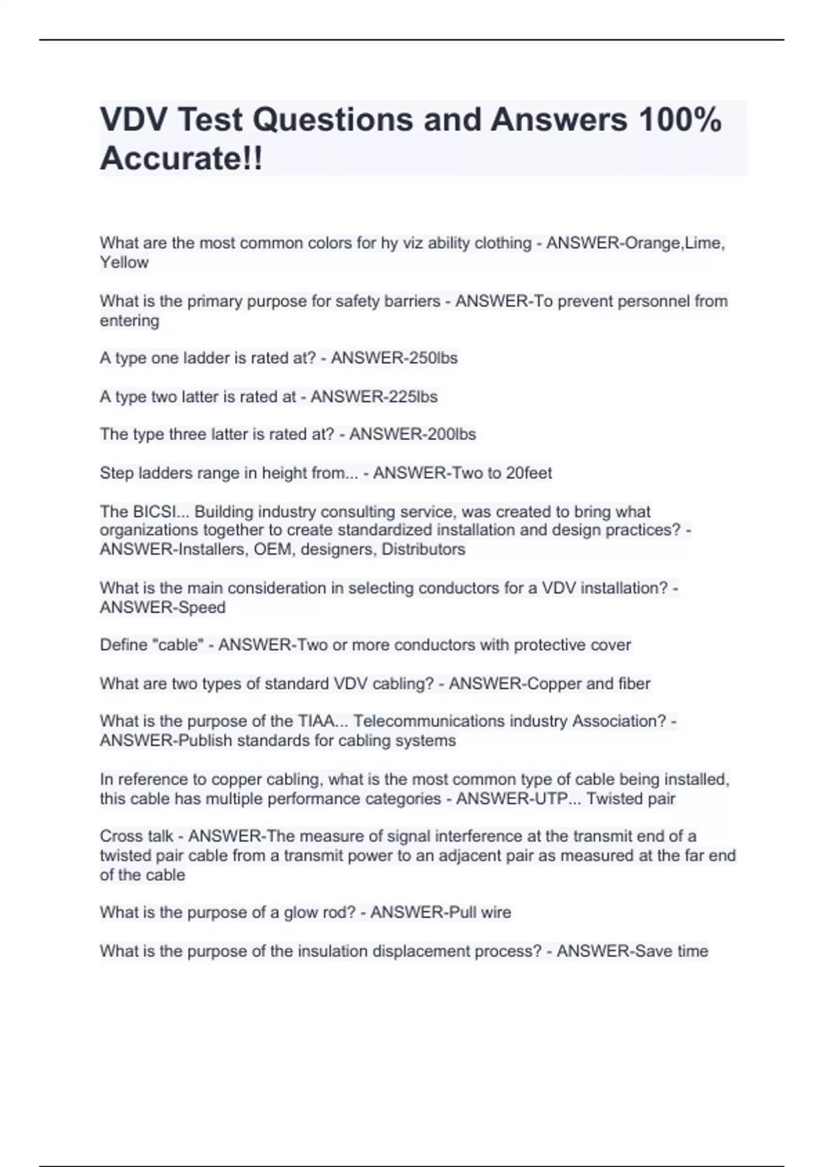 What are the most common colors for hy viz ability clothing - ANSWER-Orange,Lime, Yellow What is the primary purpose for safety barriers - ANSWER-To prevent personnel from entering A type one ladder is rated at? - ANSWER-250lbs A type two latter is rated at - ANSWER-225lbs The type three latter is rated at? - ANSWER-200lbs Step ladders range in height from... - ANSWER-Two to 20feet The BICSI... Building industry consulting service, was created to bring what organizations together to create standardized installation and design practices? - ANSWER-Installers, OEM, designers, Distributors What is the main consideration in selecting conductors for a VDV installation? - ANSWER-Speed Define "cable" - ANSWER-Two or more conductors with protective cover