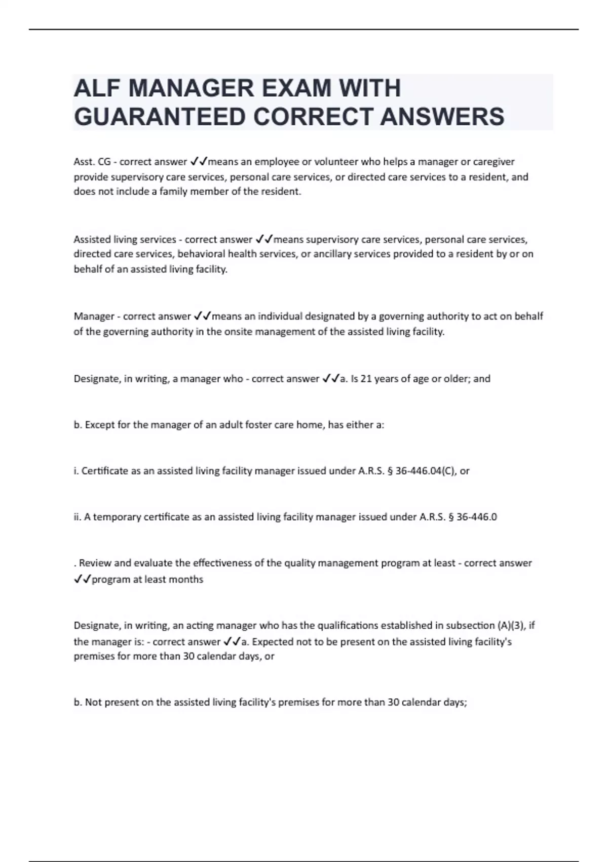 Asst. CG - correct answer means an employee or volunteer who helps a manager or caregiver provide supervisory care services, personal care services, or directed care services to a resident, and does not include a family member of the resident. Assisted living services - correct answer means supervisory care services, personal care services, directed care services, behavioral health services, or ancillary services provided to a resident by or on behalf of an assisted living facility. Manager - correct answer means an individual designated by a governing authority to act on behalf of the governing authority in the onsite management of the assisted living facility. Designate, in writing, a manager who - correct answer a. Is 21 years of age or older; and b. Except for the manager of an adult foster care home, has either a: i. Certificate as an assisted living facility manager issued under A.R.S. § 36-446.04(C), or ii. A temporary certificate as an assisted living facility manager issued under A.R.S. § 36-446.0 . Review and evaluate the effectiveness of the quality management program at least - correct answer program at least months Designate, in writing, an acting manager who has the qualifications established in subsection (A)(3), if the manager is: - correct answer a. Expected not to be present on the assisted living facility's premises for more than 30 calendar days, or b. Not present on the assisted living facility's premises for more than 30 calendar days; A manager: - correct answer 1. Is directly accountable to the governing authority of an assisted