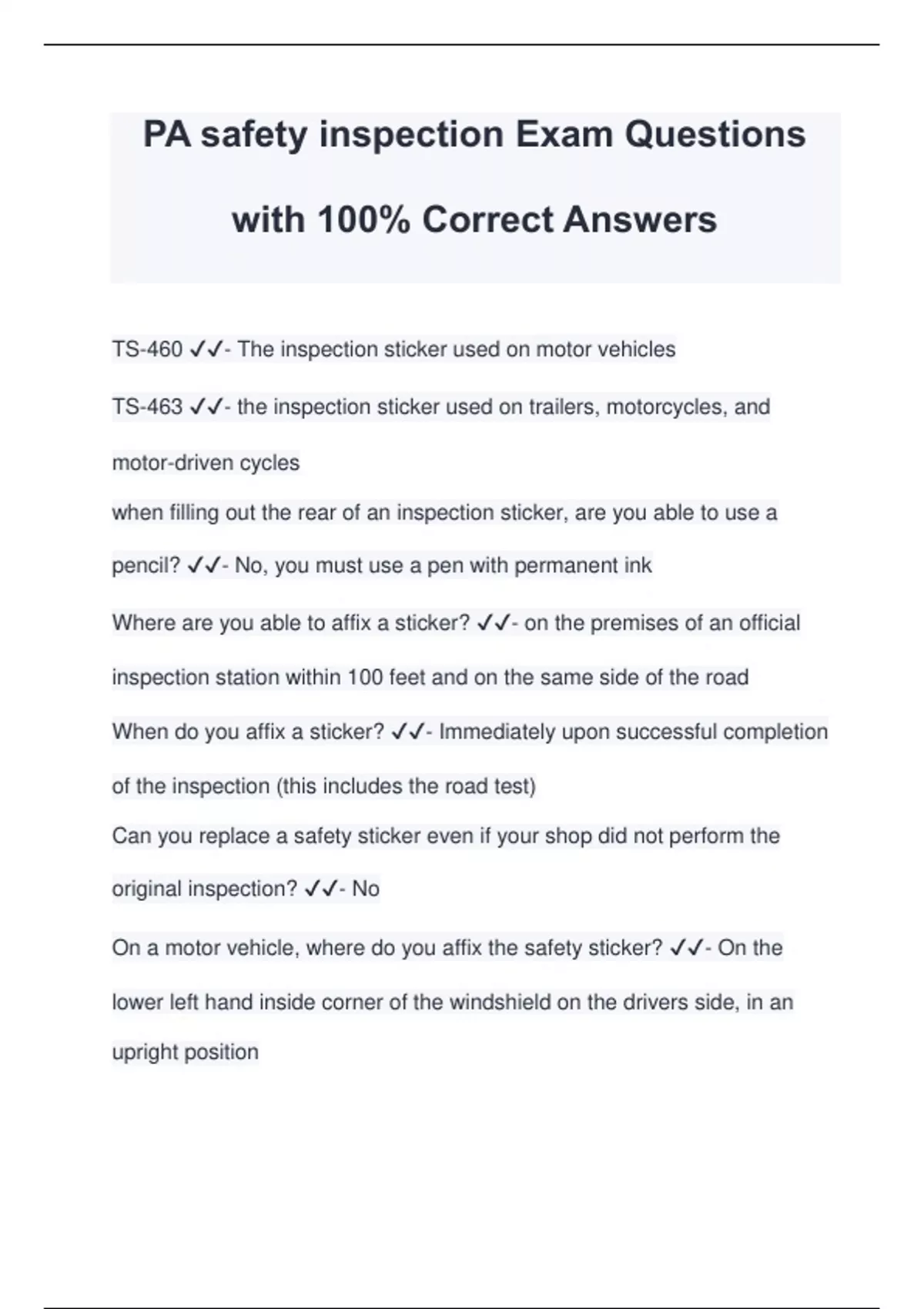 PA safety inspection Exam Questions with 100% Correct Answers TS-460 - The inspection sticker used on motor vehicles TS-463 - the inspection sticker used on trailers, motorcycles, and motor-driven cycles when filling out the rear of an inspection sticker, are you able to use a pencil? - No, you must use a pen with permanent ink Where are you able to affix a sticker? - on the premises of an official inspection station within 100 feet and on the same side of the road When do you affix a sticker? - Immediately upon successful completion of the inspection (this includes the road test) Can you replace a safety sticker even if your shop did not perform the original inspection? - No On a motor vehicle, where do you affix the safety sticker? - On the lower left hand inside corner of the windshield on the drivers side, in an upright position