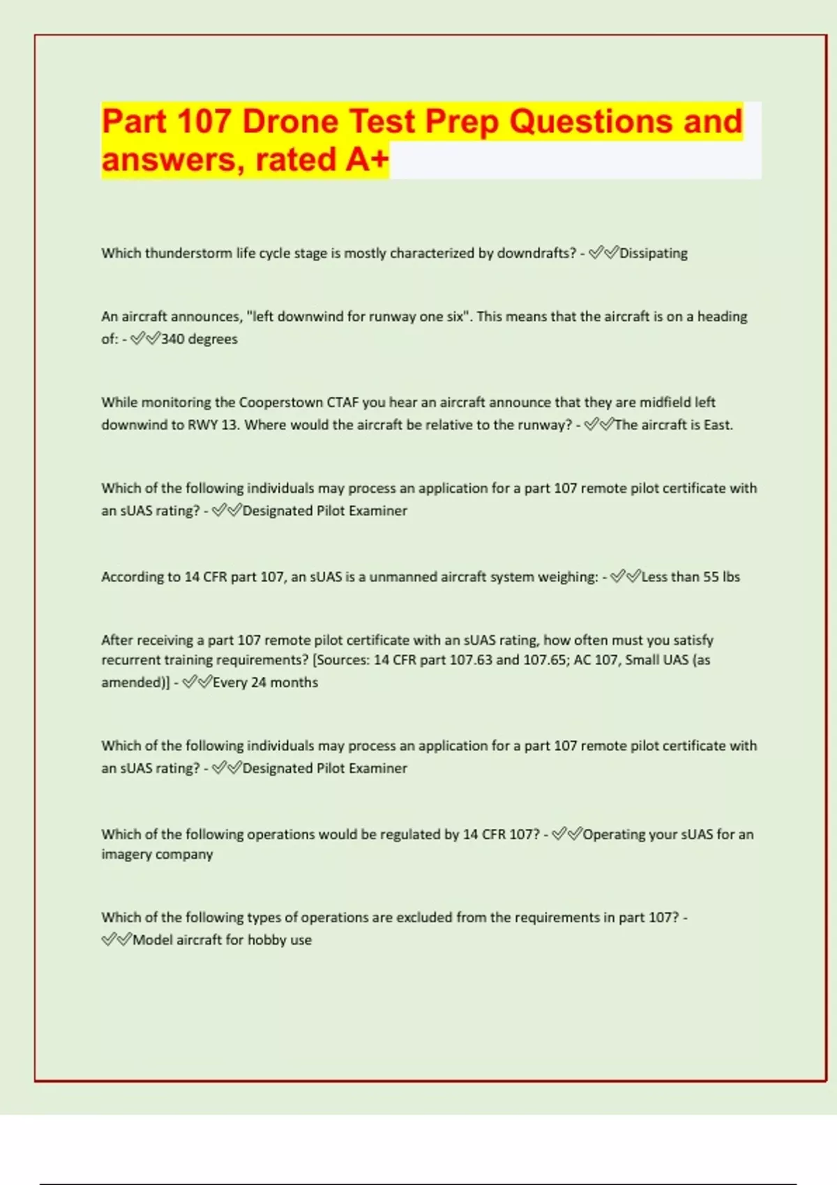 Part 107 Drone Test Prep Questions and answers, rated A+ Which thunderstorm life cycle stage is mostly characterized by downdrafts? - Dissipating An aircraft announces, "left downwind for runway one six". This means that the aircraft is on a heading of: - 340 degrees While monitoring the Cooperstown CTAF you hear an aircraft announce that they are midfield left downwind to RWY 13. Where would the aircraft be relative to the runway? - The aircraft is East. Which of the following individuals may process an application for a part 107 remote pilot certificate with an sUAS rating? - Designated Pilot Examiner According to 14 CFR part 107, an sUAS is a unmanned aircraft system weighing: - Less than 55 lbs After receiving a part 107 remote pilot certificate with an sUAS rating, how often must you satisfy recurrent training requirements? [Sources: 14 CFR part 107.63 and 107.65; AC 107, Small UAS (as amended)] - Every 24 months Which of the following individuals may process an application for a part 107 remote pilot certificate with an sUAS rating? - Designated Pilot Examiner Which of the following operations would be regulated by 14 CFR 107? - Operating your sUAS for an imagery company Which of the following types of operations are excluded from the requirements in part 107? - Model aircraft for hobby use Unmanned aircraft means an aircraft operated: - Without the possibility of direct human intervention from within or on the aircraft When using a small unmanned aircraft in a commercial operation, who is responsible for informing the participants about emergency procedures? - The Remote Pilot in Command A person without a part 107 remote pilot certificate may operate an sUAS for commercial operations: - Under the direct supervision of a Remote PIC A person whose sole task is watching the sUAS to report hazards to the rest of the crew is called: - Visual observer When adapting crew resource management (CRM) concepts to the operation of a small unmanned aircraft, CRM must be integrated into: - All phases of the operation You have been hired as a Remote Pilot in Command by a l