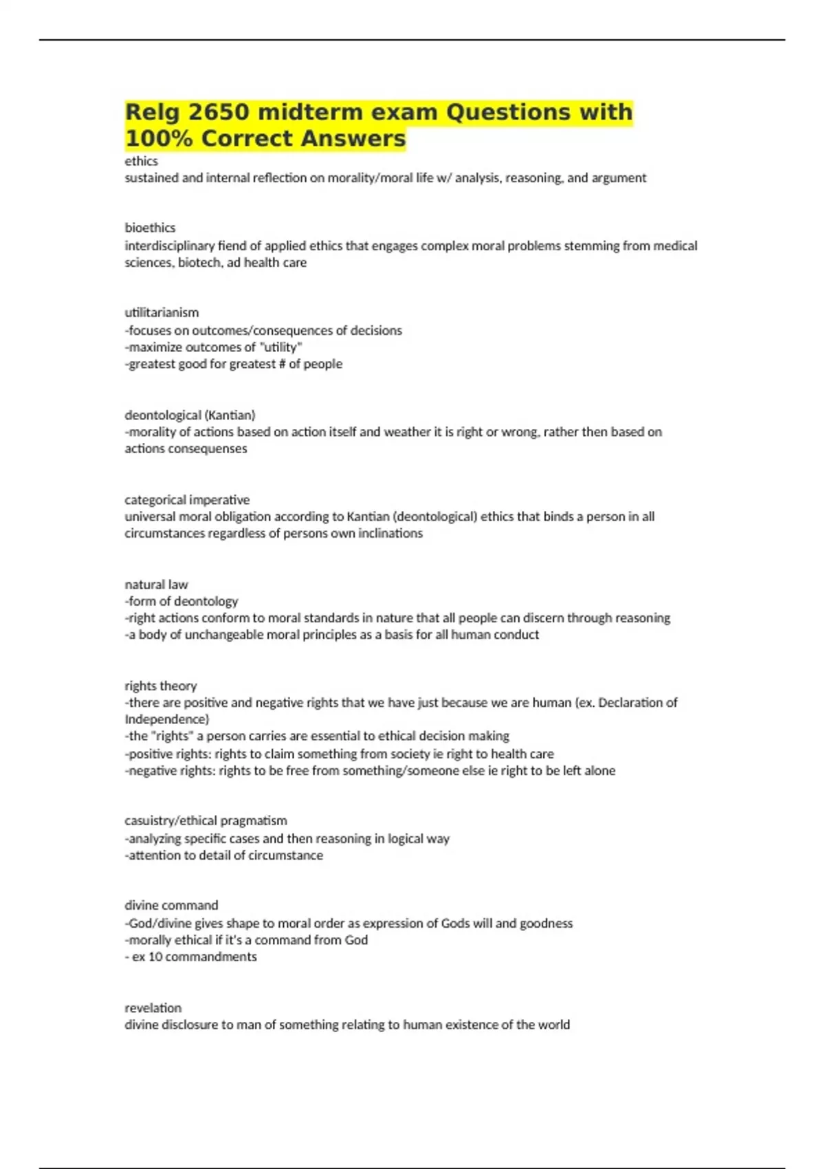 Relg 2650 midterm exam Questions with 100% Correct Answers ethics sustained and internal reflection on morality/moral life w/ analysis, reasoning, and argument bioethics interdisciplinary fiend of applied ethics that engages complex moral problems stemming from medical sciences, biotech, ad health care utilitarianism -focuses on outcomes/consequences of decisions -maximize outcomes of "utility" -greatest good for greatest # of people deontological (Kantian) -morality of actions based on action itself and weather it is right or wrong, rather then based on actions consequenses categorical imperative universal moral obligation according to Kantian (deontological) ethics that binds a person in all circumstances regardless of persons own inclinations natural law -form of deontology -right actions conform to moral standards in nature that all people can discern through reasoning -a body of unchangeable moral principles as a basis for all human conduct rights theory -there are positive and negative rights that we have just because we are human (ex. Declaration of Independence) -the "rights" a person carries are essential to ethical decision making -positive rights: rights to claim something from society ie right to health care -negative rights: rights to be free from something/someone else ie right to be left alone casuistry/ethical pragmatism -analyzing specific cases and then reasoning in logical way -attention to detail of circumstance divine command -God/divine gives shape to moral order as expression of Gods will and goodness -morally ethical if it's a command from God - ex 10 commandments revelation divine disclosure to man of something relating to human existence of the world covenant both have responsibilities, an agreement between God and his people prophets there to call people back to God and tell them and tell them how to follow the covenant in the future Torah -first of 5 books of bible- "law" -says little about medical care Talmud
