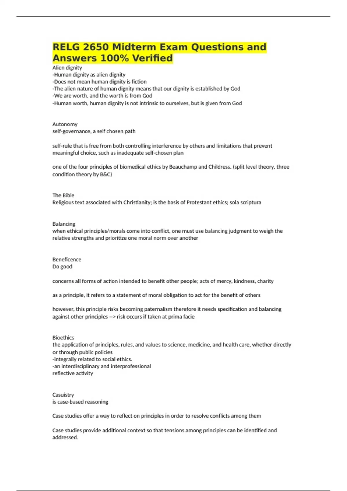 RELG 2650 Midterm Exam Questions and Answers 100% Verified Alien dignity -Human dignity as alien dignity -Does not mean human dignity is fiction -The alien nature of human dignity means that our dignity is established by God -We are worth, and the worth is from God -Human worth, human dignity is not intrinsic to ourselves, but is given from God Autonomy self-governance, a self chosen path self-rule that is free from both controlling interference by others and limitations that prevent meaningful choice, such as inadequate self-chosen plan one of the four principles of biomedical ethics by Beauchamp and Childress. (split level theory, three condition theory by B&C) The Bible Religious text associated with Christianity; is the basis of Protestant ethics; sola scriptura Balancing when ethical principles/morals come into conflict, one must use balancing judgment to weigh the relative strengths and prioritize one moral norm over another Beneficence Do good concerns all forms of action intended to benefit other people; acts of mercy, kindness, charity as a principle, it refers to a statement of moral obligation to act for the benefit of others however, this principle risks becoming paternalism therefore it needs specification and balancing against other principles --> risk occurs if taken at prima facie Bioethics the application of principles, rules, and values to science, medicine, and health care, whether directly or through public policies -integrally related to social ethics. -an interdisciplinary and interprofessional reflective activity Casuistry is case-based reasoning Case studies offer a way to reflect on principles in order to resolve conflicts among them Case studies provide additional context so that tensions among principles can be identified and addressed. Still, moral regret or moral residue is common Communal-relational critique argue that the principles misunderstand the social aspects of human relationships in medicine used to organize critique B&C's principles used by Keenan and Zoloth because they believe B&C place too much emphasis on autonomy Conscientization raising awareness and consciousness about how structures can cause injustice and inequality. Consciousness raising -Explains the process of coming to understand how social structures cause injustice -Involves discovering that evil not only present in the hearts of powerful individuals who muck things up for the rest of us but evil is embedded in the very structures of society -Structures, not just individuals who work within them, must be changed if the world is to be changed -Coming to realize the effects of structural sins in creating injustice -Liberation theology uses the tool of social analysis to reveal the ways by which social structures cause social misery; how structural sin cause inequality Consent (explicit, informed, tacit, etc.) acquiring permission from a patient/research subject