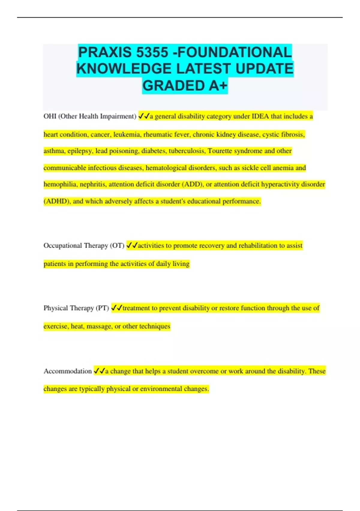 PRAXIS 5355 -FOUNDATIONAL KNOWLEDGE LATEST UPDATE GRADED A+ OHI (Other Health Impairment) a general disability category under IDEA that includes a heart condition, cancer, leukemia, rheumatic fever, chronic kidney disease, cystic fibrosis, asthma, epilepsy, lead poisoning, diabetes, tuberculosis, Tourette syndrome and other communicable infectious diseases, hematological disorders, such as sickle cell anemia and hemophilia, nephritis, attention deficit disorder (ADD), or attention deficit hyperactivity disorder (ADHD), and which adversely affects a student's educational performance. Occupational Therapy (OT) activities to promote recovery and rehabilitation to assist patients in performing the activities of daily living Physical Therapy (PT) treatment to prevent disability or restore function through the use of exercise, heat, massage, or other techniques Accommodation a change that helps a student overcome or work around the disability. These changes are typically physical or environmental changes. Modification change "what" is learned and therefore change the content of the grade - specific curriculum Self Actualization according to Maslow, one of the ultimate psychological needs that arises after basic physical and psychological needs are met and self-esteem is achieved; the motivation to fulfill one's potential Intrinsic Motivation a desire to perform a behavior effectively for its own sake Striving for Success Describes actions of people who are motivated by highly developed social interest. Learned Helplessness the tendency to fail to act to escape from a situation because of a history of repeated failures in the past Functional Curriculum a curriculum that emphasizes practical life skills rather than academic skills Social Curriculum Learning social behavior appropriate for peer groups that are not friendship groups Supplementary Curriculum required in special education when the needs of the student are not met by a traditional or existing curriculum Integrated Curriculum a school curriculum that draws from two or more subject areas and focuses on a theme or concept rather than on a single subject Erikson's Psychological Development 1- Trust vs. Distrust (birth-1) 2- Autonomy vs. Shame and Doubt (1-3) 3- Initiative vs. Guilt (3-5) 4- Industry vs. Inferiority (6-11) 5- Identity vs. Role Confusion (11-22) 6- Intimacy vs. Isolation (22-40) (marriage) 7- Generativity vs. Stagnation (40-65) (kids) 8. Integrity vs. Despair (65+) (winding down)