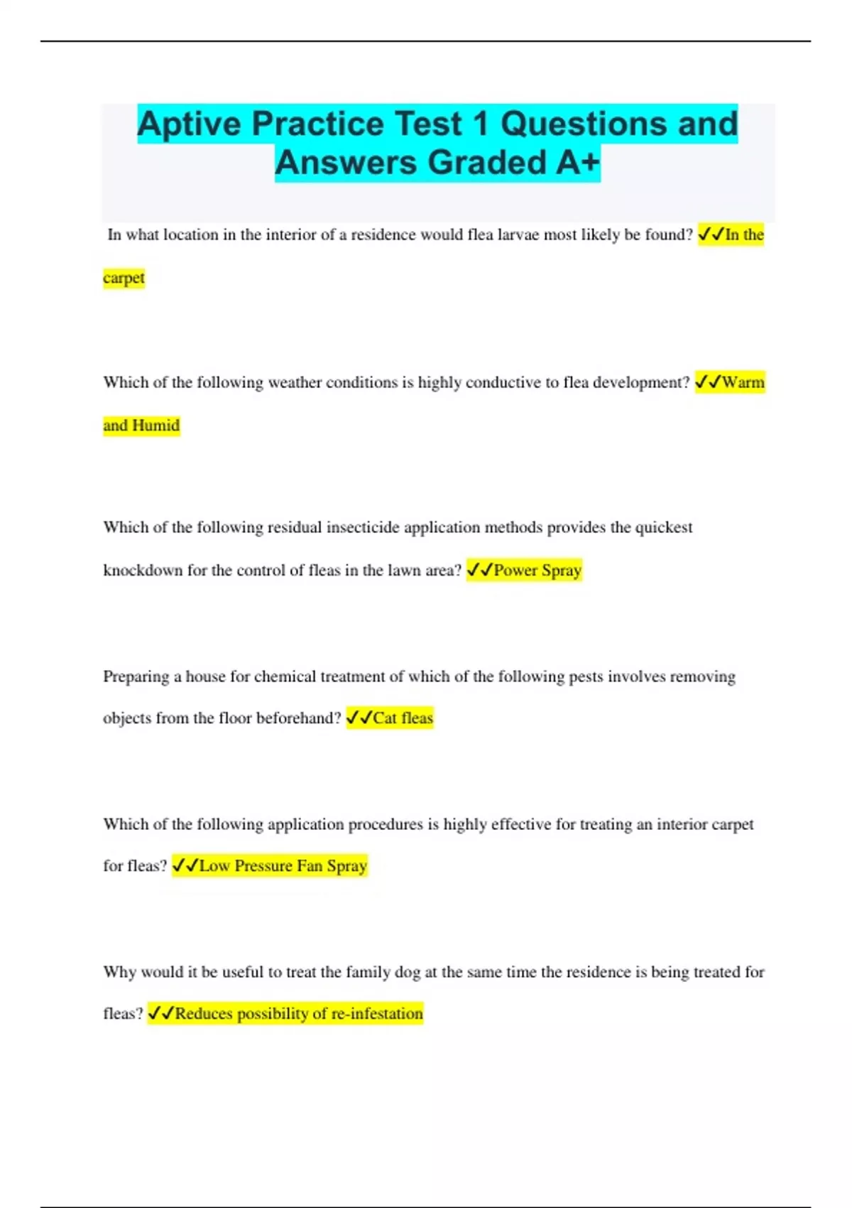 Aptive Practice Test 1 Questions and Answers Graded A+ In what location in the interior of a residence would flea larvae most likely be found? In the carpet Which of the following weather conditions is highly conductive to flea development? Warm and Humid Which of the following residual insecticide application methods provides the quickest knockdown for the control of fleas in the lawn area? Power Spray Preparing a house for chemical treatment of which of the following pests involves removing objects from the floor beforehand? Cat fleas Which of the following application procedures is highly effective for treating an interior carpet for fleas? Low Pressure Fan Spray Why would it be useful to treat the family dog at the same time the residence is being treated for fleas? Reduces possibility of re-infestation How does an insect growth regulator (IGR) treatment affect fleas? Prevents fleas from reproducing It is necessary to find out from the homeowner where the pet's bedding is during a flea inspection in a residence. True In which stage of a flea's life cycle are pesticides ineffective and hardest to control? Pupae Why should you have the homeowner vacuum after treatment for fleas? To cause pupa to turn into adult Flea eggs can be recognized by their ________________ color. Pearly white The ____________ flea is the most common pest in and around U.S homes? Cat Which of the following spiders is indicated by strong, irregularly-arranged webs? Black Widow What are the characteristics of a Black widow spider web? Irregular, scaffold type Should a house centipede be found in a home, which of the following areas should be inspected by a field representative? Damp area outdoors A centipede uses its ____________ to inject poison? Claw A centipede can be described as having? Elongate, flattened, with one pair of legs per body segment Which of the following long-term methods is recommended for controlling house flies in a food processing facility? Sanitation The owner of a commercial storage facility complains of sudden infestation of green bottle flies. Which of the following questions should the owner be asked in the initial interview? Have dead rodents been discovered at the site? Which of the following actions should be taken first to control fruit or vinegar flies? Locate all breeding sources (see plumbing drains) Although the exterior of an apartment complex has been treated for flies the tenants still complain of seeing many flies in the courtyard. Which of the following actions should be taken? Identify the source, and inform the landlord of any conditions conducive to fly infestation. The homeowner reports seeing a small fly with red eyes hovering around trash compactor. Which type of fly is it? Fruit fly Drain flies can be described by which of the following characteristics? Tiny yellowish-black flies found near damp moist areas The __________ fly is known to primarily reproduce in or around feces. Bottle In which of the following areas are the majority of dead flies located? Window sills Fungus Gnats are found in potted plants;