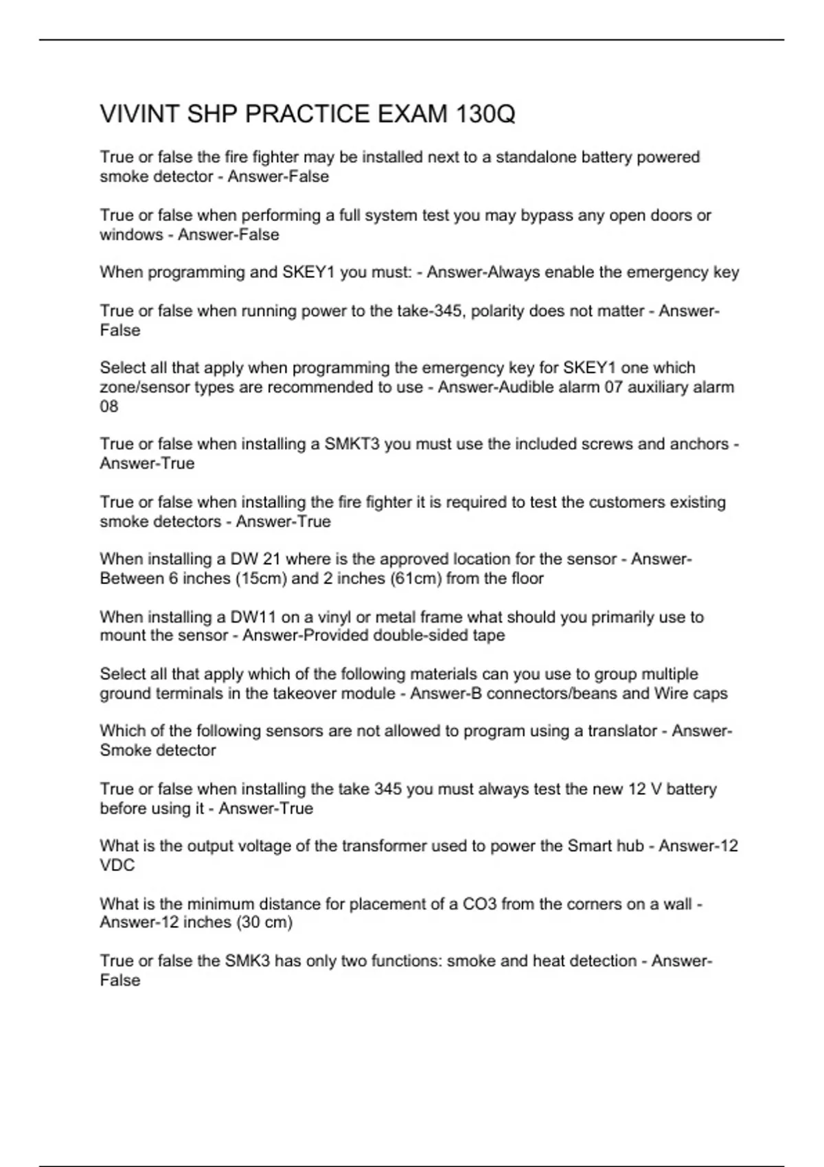True or false the fire fighter may be installed next to a standalone battery powered smoke detector - Answer-False True or false when performing a full system test you may bypass any open doors or windows - Answer-False When programming and SKEY1 you must: - Answer-Always enable the emergency key True or false when running power to the take-345, polarity does not matter - Answer-False Select all that apply when programming the emergency key for SKEY1 one which zone/sensor types are recommended to use - Answer-Audible alarm 07 auxiliary alarm 08 True or false when installing a SMKT3 you must use the included screws and anchors - Answer-True True or false when installing the fire fighter it is required to test the customers existing smoke detectors - Answer-True When installing a DW 21 where is the approved location for the sensor - Answer-Between 6 inches (15cm) and 2 inches (61cm) from the floor When installing a DW11 on a vinyl or metal frame what should you primarily use to mount the sensor - Answer-Provided double-sided tape Select all that apply which of the following materials can you use to group multiple ground terminals in the takeover module - Answer-B connectors/beans and Wire caps Which of the following sensors are not allowed to program using a translator - Answer-Smoke detector True or false when installing the take 345 you must always test the new 12 V battery before using it - Answer-True What is the output voltage of the transformer used to power the Smart hub - Answer-12 VDC What is the minimum distance for placement of a CO3 from the corners on a wall - Answer-