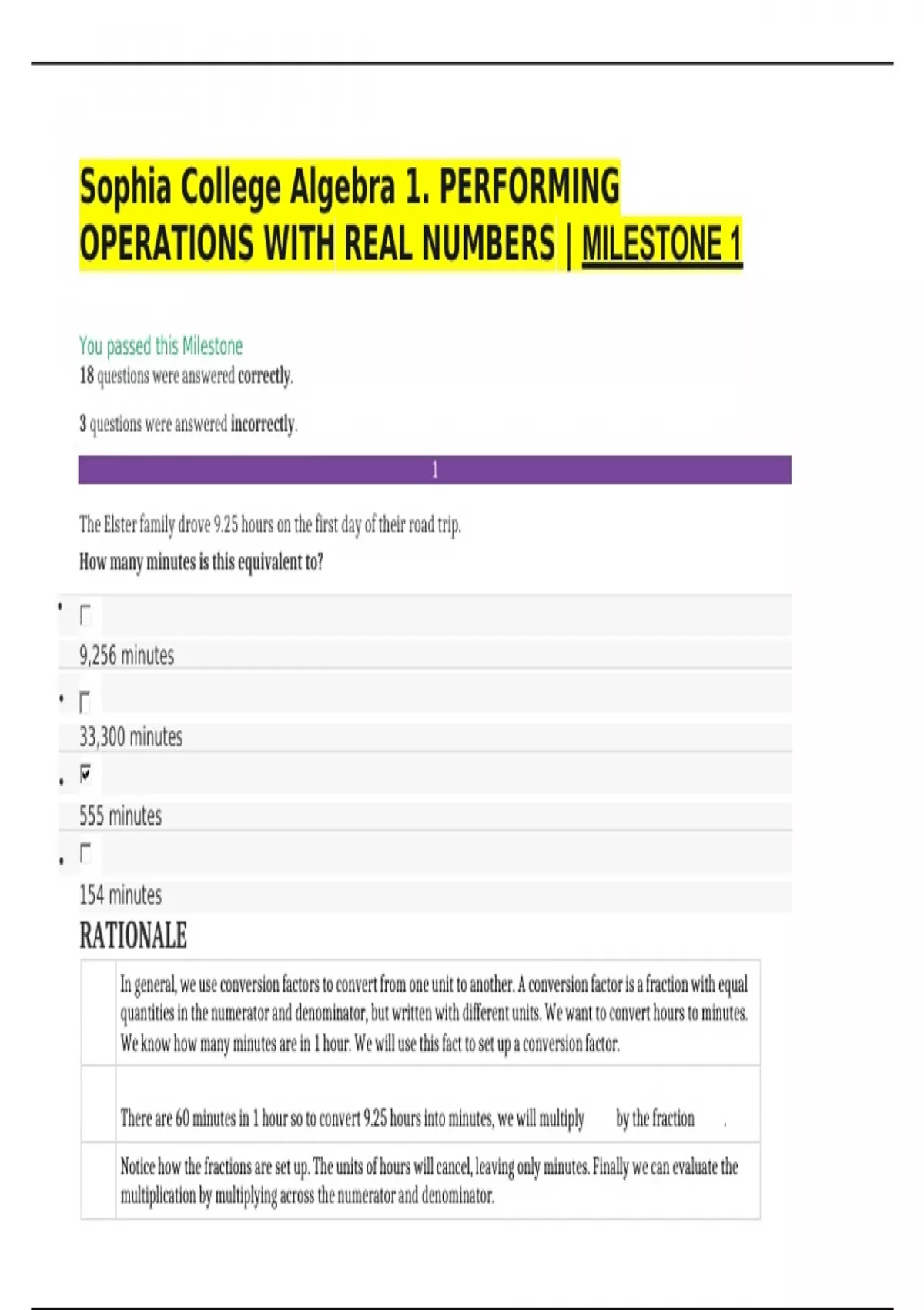 Sophia College Algebra 1. PERFORMING OPERATIONS WITH REAL NUMBERS | MILESTONE 1 You passed this Milestone 18 questions were answered correctly. 3 questions were answered incorrectly. 1 The Elster family drove 9.25 hours on the first day of their road trip. How many minutes is this equivalent to? 9,256 minutes 33,300 minutes 555 minutes 154 minutes RATIONALE In general, we use conversion factors to convert from one unit to another. A conversion factor is a fraction with equal quantities in the numerator and denominator, but written with different units. We want to convert hours to minutes. We know how many minutes are in 1 hour. We will use this fact to set up a conversion factor. There are 60 minutes in 1 hour so to convert 9.25 hours into minutes, we will multiply by the fraction . Notice how the fractions are set up. The units of hours will cancel, leaving only minutes. Finally we can evaluate the multiplication by multiplying across the numerator and denominator. In the numerator, 9.25 times 60 equals 555. 9.25 hours is equivalent to 555 minutes. CONCEPT Converting Units 2 Perform the following operations and write the result as a single number. [4 + 8 × (5 – 3)] ÷ 5 + 6 10.8 10 2 1.8 RATIONALE Following the Order of Operations, we must first evaluate everything in parentheses and grouping symbols. When there are brackets or braces, evaluate the innermost operations first. Here, we must evaluate 5 minus 3 first. 5 minus 3 is 2. There are still operations inside grouping symbols to evaluate. Multiplication comes before addition, so we must evaluate 8 times 2 next. 8 times 2 is 16. Next, we add 4 and 16 to complete the operations inside parentheses. 4 plus 16 is 20. Now there is just division and subtraction. Division comes before subtraction in the Order of Operations, so we divide 20 by 5 next. 20 divided by 5 is 4. Lastly, add 4 and 6. 4 plus 6 is 10. CONCEPT Introduction to Order of Operations 3 Consider the following expression: What is the value of this expression when x = -5? • • • • RATIONALE To find the value of this expression when x = -5, begin by substituting -5 for every instance of x in the expression. Once all instances of x have been substituted with -5, we can evaluate the expression. The division bar acts as a group symbol, separating the expression in the numerator, |-5|, from the expression in the denominator, . Evaluate each of them separately before dividing, starting with the absolute value of -5. Recall that the absolute value of a number is its non-negative value. The absolute value of -5 is 5. Next, in the denominator, we can square -5. Remember that a negative number squared is always positive so -5 squared is 25. Finally, simplify the fraction. The fraction can be simplified to . CONCEPT Operations as Grouping Symbols 4 Simplify the following radical expression. • • • • RATIONALE To simplify this expression, we can use the Product Property of Radicals to separate the expression into two radicals. The cube root of can be written as the cube root of 64 times the cube root of . Next, we can write each radical expression using a fractional exponent in order to simplify. The index of the radical determines the denominator of the fractional exponent. The index here is 3, so each expression underneath the radical will be raised to the power. Now that we have changed our original expression from a radical to fractional exponents, we can evaluate and simplify the two expressions that are raised to the power. to the power of evaluates to 4 because 4 raised to the 3rd power is 64 ( ). To simplify , we multiply the two exponents together. 3 times equals 1 and is simply x. The expression simplifies to 4x. CONCEPT Applying the Properties of Radicals