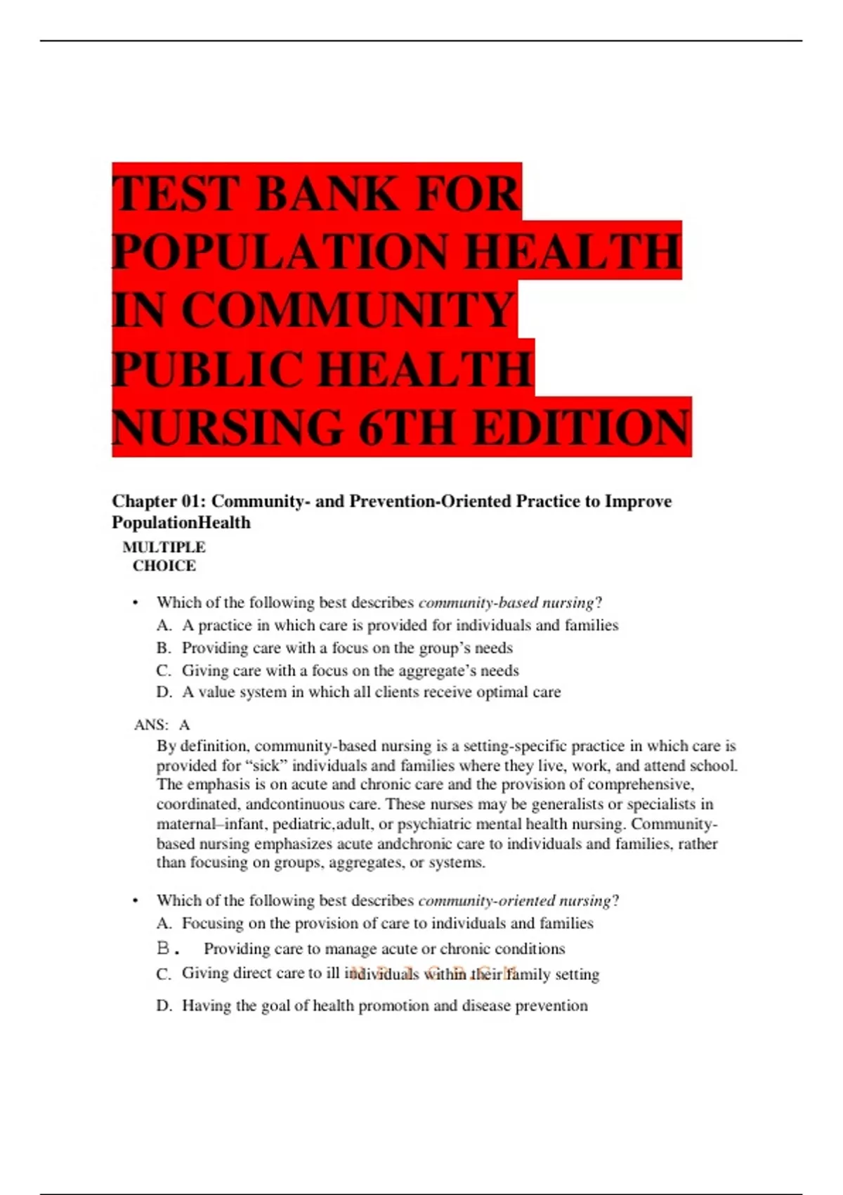 • Which of the following is the primary focus of public health nursing?