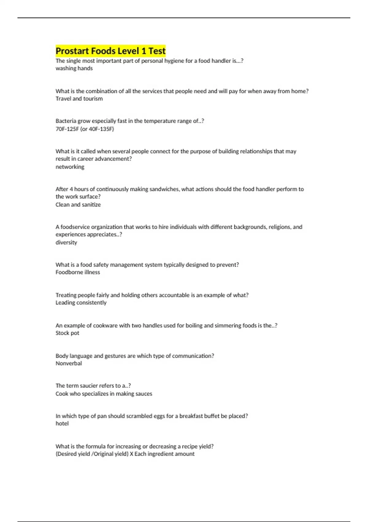 Prostart Foods Level 1 Test The single most important part of personal hygiene for a food handler is...? washing hands What is the combination of all the services that people need and will pay for when away from home? Travel and tourism Bacteria grow especially fast in the temperature range of..? 70F-125F (or 40F-135F) What is it called when several people connect for the purpose of building relationships that may result in career advancement? networking After 4 hours of continuously making sandwiches, what actions should the food handler perform to the work surface? Clean and sanitize A foodservice organization that works to hire individuals with different backgrounds, religions, and experiences appreciates..? diversity What is a food safety management system typically designed to prevent? Foodborne illness Treating people fairly and holding others accountable is an example of what? Leading consistently An example of cookware with two handles used for boiling and simmering foods is the..? Stock pot Body language and gestures are which type of communication? Nonverbal The term saucier refers to a..? Cook who specializes in making sauces In which type of pan should scrambled eggs for a breakfast buffet be placed? hotel What is the formula for increasing or decreasing a recipe yield? (Desired yield /Original yield) X Each ingredient amount