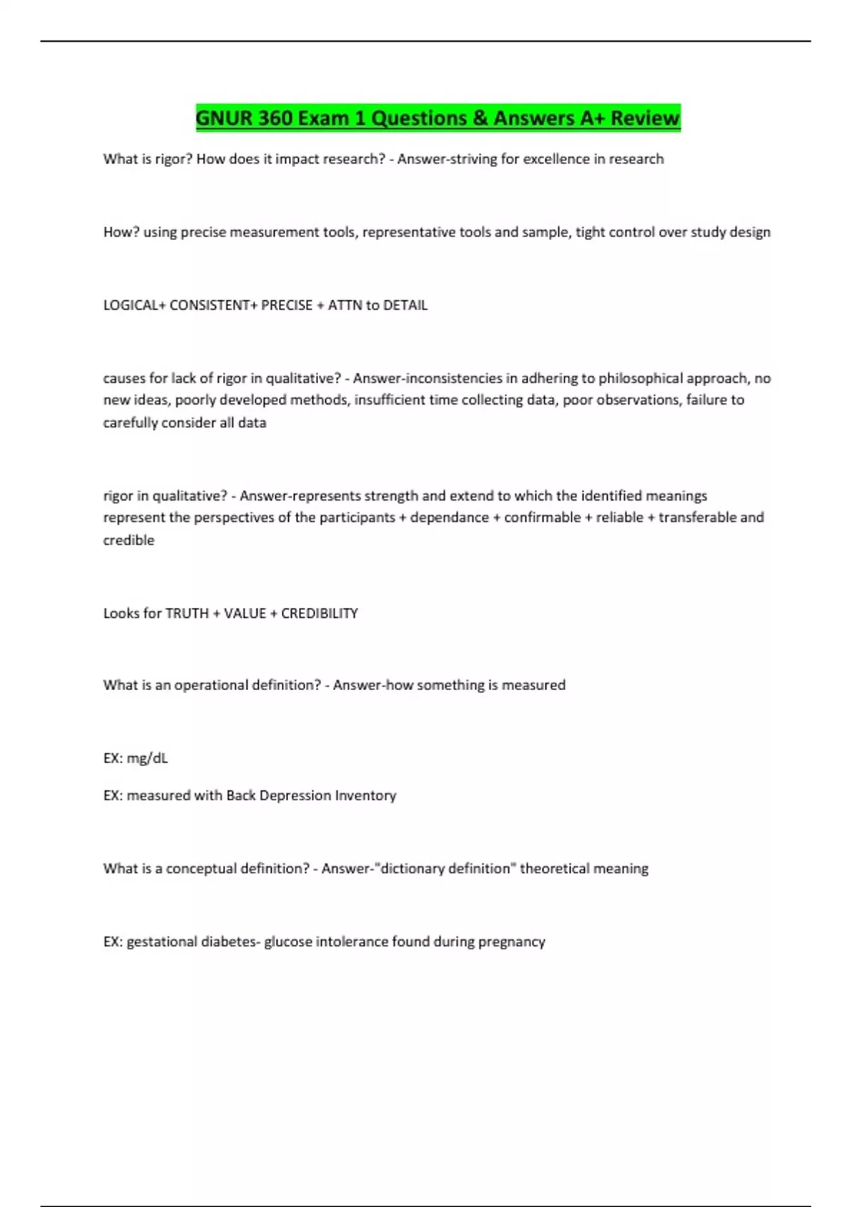 GNUR 360 Exam 1 Questions & Answers A+ Review What is rigor? How does it impact research? - Answer-striving for excellence in research How? using precise measurement tools, representative tools and sample, tight control over study design LOGICAL+ CONSISTENT+ PRECISE + ATTN to DETAIL causes for lack of rigor in qualitative? - Answer-inconsistencies in adhering to philosophical approach, no new ideas, poorly developed methods, insufficient time collecting data, poor observations, failure to carefully consider all data rigor in qualitative? - Answer-represents strength and extend to which the identified meanings represent the perspectives of the participants + dependance + confirmable + reliable + transferable and credible Looks for TRUTH + VALUE + CREDIBILITY What is an operational definition? - Answer-how something is measured EX: mg/dL EX: measured with Back Depression Inventory What is a conceptual definition? - Answer... Continues...