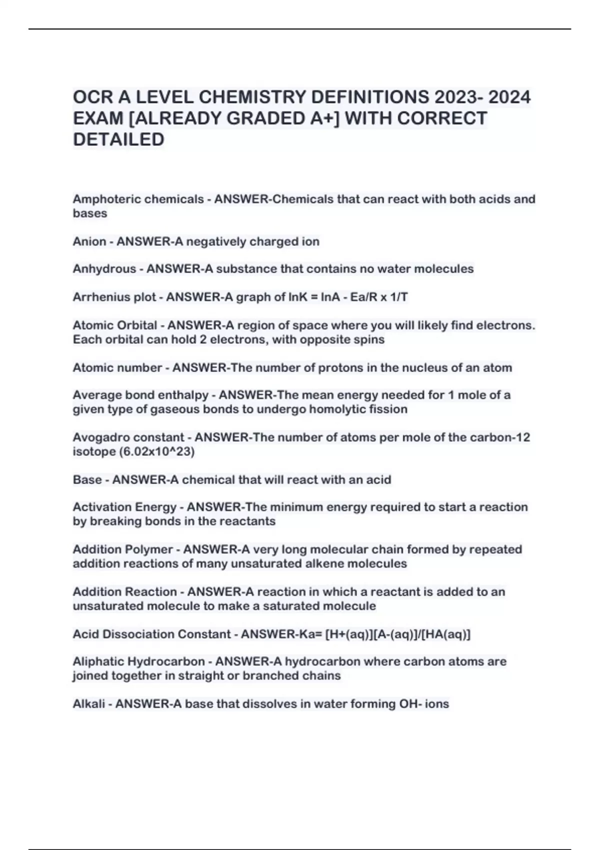 OCR A LEVEL CHEMISTRY DEFINITIONS EXAM [ALREADY GRADED A+] WITH CORRECT DETAILED Amphoteric chemicals - ANSWER-Chemicals that can react with both acids and bases Anion - ANSWER-A negatively charged ion Anhydrous - ANSWER-A substance that contains no water molecules Arrhenius plot - ANSWER-A graph of lnK = lnA - Ea/R x 1/T Atomic Orbital - ANSWER-A region of space where you will likely find electrons. Each orbital can hold 2 electrons, with opposite spins Atomic number - ANSWER-The number of protons in the nucleus of an atom Average bond enthalpy - ANSWER-The mean energy needed for 1 mole of a given type of gaseous bonds to undergo homolytic fission Avogadro constant - ANSWER-The number of atoms per mole of the carbon-12 isotope (6.02x10^23) Base - ANSWER-A chemical that will react with an acid Activation Energy - ANSWER-The minimum energy required to start a reaction by breaking bonds in the reactants Addition Polymer - ANSWER-A very long molecular chain formed by repeated addition reactions of many unsaturated alkene molecules Addition Reaction - ANSWER-A reaction in which a reactant is added to an unsaturated molecule to make a saturated molecule Acid Dissociation Constant - ANSWER-Ka= [H+(aq)][A-(aq)]/[HA(aq)] Aliphatic Hydrocarbon - ANSWER-A hydrocarbon where carbon atoms are joined together in straight or branched chains Alkali - ANSWER-A base that dissolves in water forming OH- ions Alkanes - ANSWER-The homologous series with general formula CnH2n+2 Alkylammonium salt - ANSWER-A compound where the hydrogen's on an ammonium ion have been substituted by alkyl chains