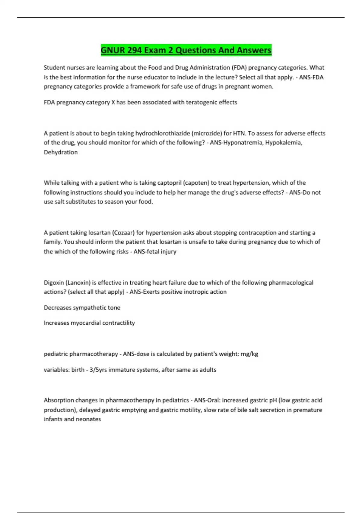 GNUR 294 Exam 2 Questions And Answers Student nurses are learning about the Food and Drug Administration (FDA) pregnancy categories. What is the best information for the nurse educator to include in the lecture? Select all that apply. - ANS-FDA pregnancy categories provide a framework for safe use of drugs in pregnant women. FDA pregnancy category X has been associated with teratogenic effects A patient is about to begin taking hydrochlorothiazide (microzide) for HTN. To assess for adverse effects of the drug, you should monitor for which of the following? - ANS-Hyponatremia, Hypokalemia, Dehydration While talking with a patient who is taking captopril (capoten) to treat hypertension, which of the following instructions should you include to help her manage the drug's adverse effects? - ANS-Do not use salt substitutes to season your food. A patient taking losartan (Cozaar) for hypertension asks about stopping contraception and starting a family. You should inform the patient that losartan is unsafe to take during pregnancy due to which of the which of the following risks - ANS-fetal injury Digoxin (Lanoxin) is effective in treating heart failure due to which of the following pharmacological actions? (select all that apply) - ANS-Exerts positive inotropic action Decreases sympathetic tone Increases myocardial contractility pediatric pharmacotherapy - ANS-dose is calculated by patient's weight: mg/kg variables: birth - 3/5yrs immature systems, after same as adults Absorption changes in pharmacotherapy in pediatrics - ANS-Oral: increased gastric pH (low gastric acid production), delayed gastric emptying and gastric motility, slow rate of bile salt secretion in premature infants and neonates IM/SQ: low blood flow to muscles and tissues Topical: Thin and highly permeable infant skin Distribution changes in pharmacotherapy in pediatrics - ANS-High Proportion of body water, more fat, immature liver function, underdeveloped blood brain barrier Metabolism changes in pharmacotherapy in pediatrics - ANS-Immaturity of hepatic CYP450 system, enzyme alcohol dehydrogenase reduced at birth excretion changes in pharmacotherapy in pediatrics - ANS-immature renal systems Absorption changes in pharmacotherapy in geriatrics - ANS-Slows, but is completed, increased gastric pH, Decreased blood flow to/from GI tract Slowed GI motility Distribution changes in pharmacotherapy in geriatrics - ANS-Increased body fat, reduction in total body water, declining liver function, inefficient blood brain barrier Metabolism changes in pharmacotherapy in geriatrics - ANS-Reduced hepatic function Excretion changes in pharmacotherapy in geriatrics - ANS-Renal function declines Which factors does the nurse recognize potentially influence oral absorption of drugs in the pediatric client? Select all that apply. - ANS-Increased gastric pH Delayed gastric emptying An older client asks the nurse how to avoid potential drug interactions. Which response by the nurse is the most appropriate? - ANS-Obtain all medications from one pharmacy when possible Which statement indicates that a client understands teaching about atorvastatin (Lipitor)? - ANS-"I should stop taking this drug if I decide to try to become pregnant." The client is prescribed digoxin (Lanoxin) for the treatment of heart failure. Which assessment findings would indicate adverse effects of this medication? - ANS-Anorexia and nausea The nurse is teaching a client about reducing the risk for coronary artery disease. An elevation in which laboratory value is most directly associated with atherosclerosis, leading to coronary artery disease? - ANS-Low-density lipoprotein (LDL) A client who takes atorvastatin (Lipitor) daily has been prescribed erythromycin for sinusitis. To prevent consequences of an adverse effect of this combination of drugs, it is most important for the nurse to monitor this client for which clinical manifestation? - ANS-New onset of muscle pain The nurse is caring for a client taking both gemfibrozil (Lopid) and warfarin (Coumadin). To maintain safety relative to the interaction? - ANS