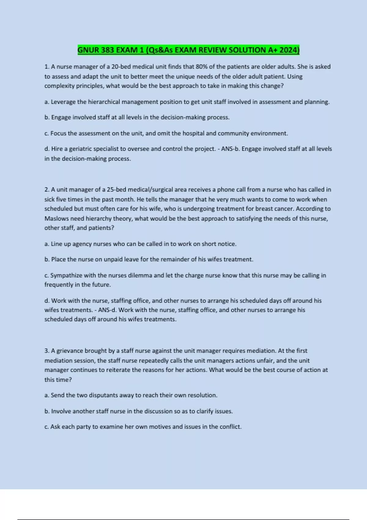 GNUR 383 EXAM 1 (Qs&As EXAM REVIEW SOLUTION A+ 2024) 1. A nurse manager of a 20-bed medical unit finds that 80% of the patients are older adults. She is asked to assess and adapt the unit to better meet the unique needs of the older adult patient. Using complexity principles, what would be the best approach to take in making this change? a. Leverage the hierarchical management position to get unit staff involved in assessment and planning. b. Engage involved staff at all levels in the decision-making process. c. Focus the assessment on the unit, and omit the hospital and community environment. d. Hire a geriatric specialist to oversee and control the project. - ANS-b. Engage involved staff at all levels in the decision-making process. 2. A unit manager of a 25-bed medical/surgical area receives a phone call from a nurse who has called in sick five times in the past month. He tells the manager that he very much wants to come to work when scheduled but must often care for his wife, who is undergoing treatment for breast cancer. According to Maslows need hierarchy theory, what would be the best approach to satisfying the needs of this nurse, other staff, and patients? a. Line up agency nurses who can be called in to work on short notice. b. Place the nurse on unpaid leave for the remainder of his wifes treatment. c. Sympathize with the nurses dilemma and let the charge nurse know that this nurse may be calling in frequently in the future. d. Work with the nurse, staffing office, and other nurses to arrange his scheduled days off around his wifes treatments. - ANS-d. Work with the nurse, staffing office, and other nurses to arrange his scheduled days off around his wifes treatments. 3. A grievance brought by a staff nurse against the unit manager requires mediation. At the first mediation session, the staff nurse repeatedly calls the unit managers actions unfair, and the unit manager continues to reiterate the reasons for her actions. What would be the best course of action at this time? a. Send the two disputants away to reach their own resolution. b. Involve another staff nurse in the discussion so as to clarify issues. c. Ask each party to examine her own motives and issues in the conflict. d. Continue to listen as the parties repeat their thoughts and feelings about the conflict. - ANS-c. Ask each party to examine her own motives and issues in the conflict. 4. At a second negotiation session, the unit manager and staff nurse are unable to reach a resolution. It would now be best to: a. Arrange another meeting in a weeks time so as to allow a cooling-off period. b. Turn the dispute over to the director of nursing. c. Insist that participants continue to talk until a resolution has been reached. d. Back the unit managers actions and end the dispute. - ANS-a. Arrange another meeting in a weeks time so as to allow a cooling-off period. 5. The manager of a surgical area has a vision for the future that requires the addition of RN assistants or unlicensed persons to feed, bathe, and walk patients. The RNs on the staff have always practiced in a primary nursingdelivery system and are very resistant to this idea. The best initial strategy in this situation would include: a. Exploring the values and feelings of the RN group in relationship to this change. b. Leaving the RNs alone for a time so they can think about the change before it is implemented. c. Dropping the idea and trying for the change in a year or so when some of the present RNs have retired. d. Hiring the assistants and allowing the RNs to see what good additions they are. - ANS-a. Exploring the values and feelings of the RN group in relationship to this change. 6. As the RN charge nurse on the night shift in a small long-term care facility, youve found that there is little turnover among your LPN and nursing assistant (NA) staff members, but they are not very motivated to go beyond their job descriptions in their work. Which of the following strategies might motivate the staff and lead to greater job satisfaction? a. Ask the director of nursing to offer higher wages and bonuses for extra work for the night LPNs and NAs. b. Allow the LPNs and NAs greater decision-making power within the scope of their positions in the institution. c. Hire additional staff so that there are more staff available for enhanced care and individual workloads are lessened. d. Ask the director of nursing to increase job security for night staff by having them sign contracts that guarantee work. - ANS-b. Allow the LPNs and NAs greater decision-making power within the scope of their positions in the institution. 7. As the nurse manager who wants to increase motivation by providing motivating factors, which action would you select?...