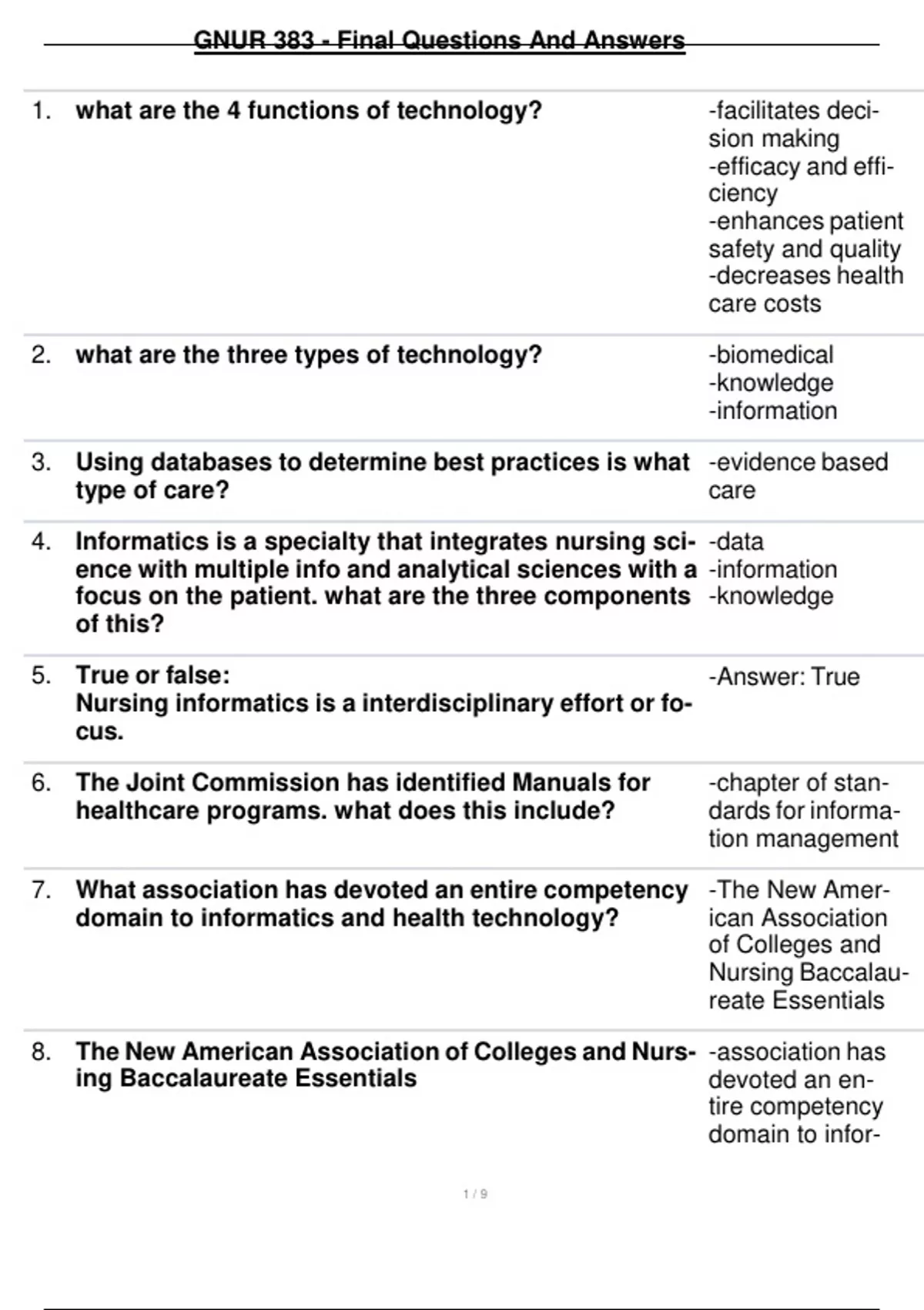 GNUR 383 - Final Questions And Answers 1 / 9 1. what are the 4 functions of technology? -facilitates decision making -efficacy and efficiency -enhances patient safety and quality -decreases health care costs 2. what are the three types of technology? -biomedical -knowledge -information 3. Using databases to determine best practices is what type of care? 4. Informatics is a specialty that integrates nursing science with multiple info and analytical sciences with a focus on the patient. what are the three components of this? 5. True or false: Nursing informatics is a interdisciplinary effort or focus. 6. The Joint Commission has identified Manuals for healthcare programs. what does this include? 7. What association has devoted an entire competency domain to informatics and health technology? 8. The New American Association of Colleges and Nursing Baccalaureate Essentials Continues...
