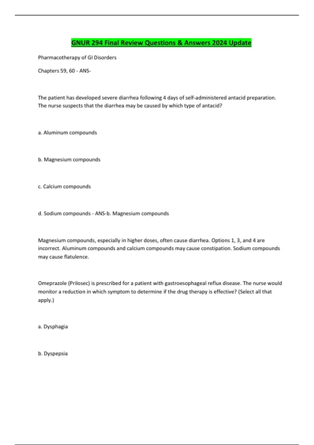 GNUR 294 Final Review Questions & Answers 2024 Update Pharmacotherapy of GI Disorders Chapters 59, 60 - ANSThe patient has developed severe diarrhea following 4 days of self-administered antacid preparation. The nurse suspects that the diarrhea may be caused by which type of antacid? a. Aluminum compounds b. Magnesium compounds c. Calcium compounds d. Sodium compounds - ANS-b. Magnesium compounds Magnesium compounds, especially in higher doses, often cause diarrhea. Options 1, 3, and 4 are incorrect. Aluminum compounds and calcium compounds may cause constipation. Sodium compounds may cause flatulence. Omeprazole (Prilosec) is prescribed for a patient with gastroesophageal reflux disease. The nurse would monitor a reduction in which symptom to determine if the drug therapy is effective? (Select all that apply.) a. Dysphagia b. Dyspepsia c. Appetite d. Nausea e. Belching - ANS-a, b, d, e Symptoms of GERD include dysphagia, dyspepsia, nausea, belching, heartburn, and chest pain. Option 3 is incorrect. The nurse would not expect a decrease in the patient's appetite due to this medication. The nurse is scheduling the patient's daily medication. When would be the most appropriate time for the patient to receive proton pump inhibitors?...
