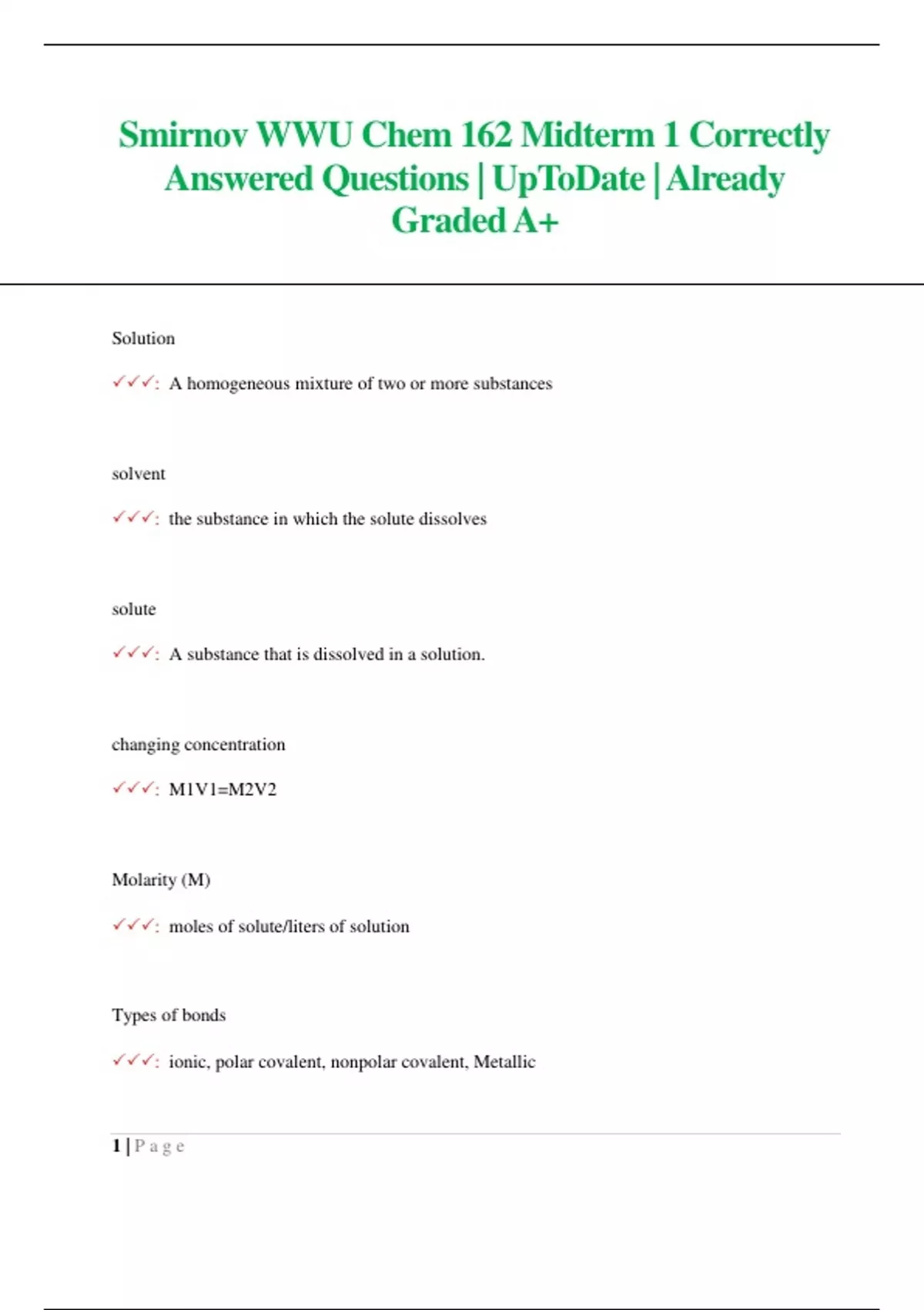Smirnov WWU Chem 162 Midterm 1 Correctly Answered Questions| UpToDate | Already Graded A+
