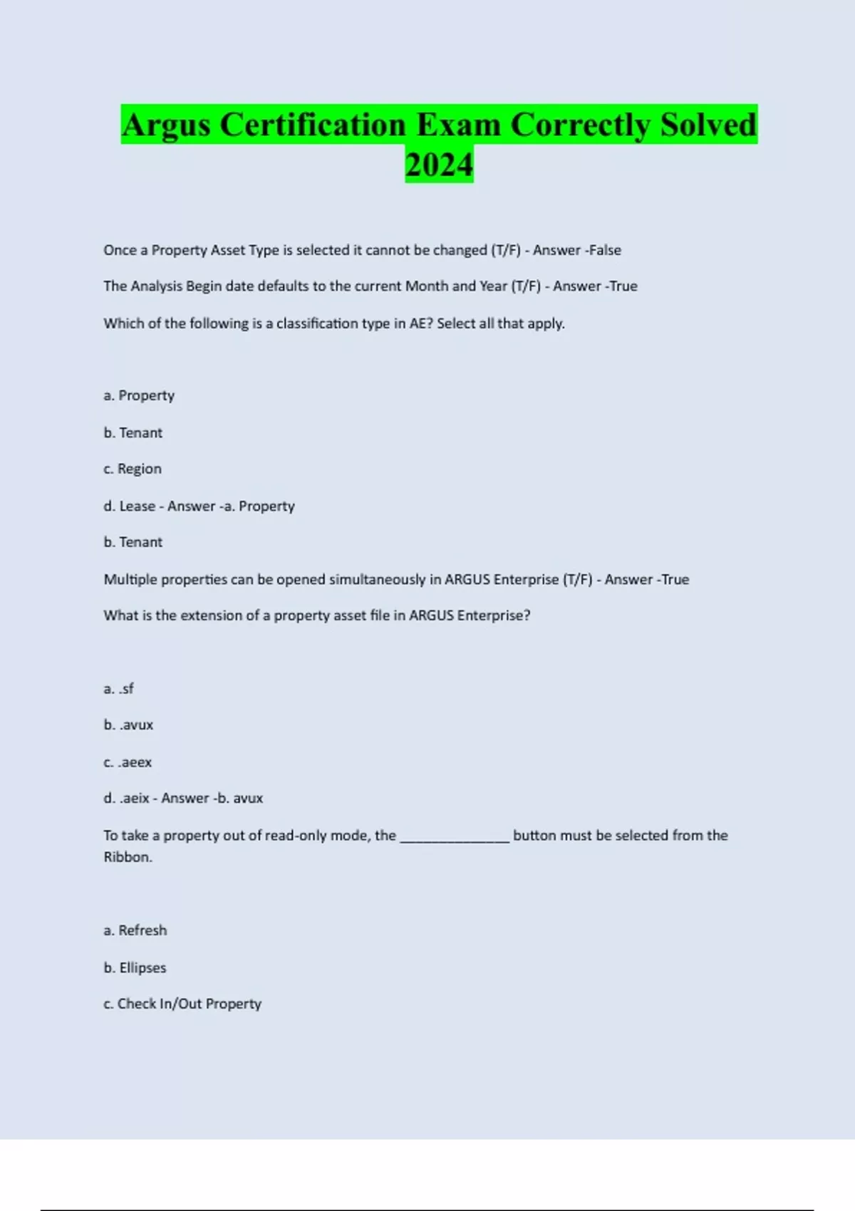 Argus Certification Exam Correctly Solved 2024 Once a Property Asset Type is selected it cannot be changed (T/F) - Answer -False The Analysis Begin date defaults to the current Month and Year (T/F) - Answer -True Which of the following is a classification type in AE? Select all that apply. a. Property b. Tenant c. Region d. Lease - Answer -a. Property b. Tenant Multiple properties can be opened simultaneously in ARGUS Enterprise (T/F) - Answer -True What is the extension of a property asset file in ARGUS Enterprise? a. .sf b. .avux c. .aeex d. .aeix - Answer -b. avux To take a property out of read-only mode, the ______________ button must be selected from the Ribbon. a. Refresh b. Elli