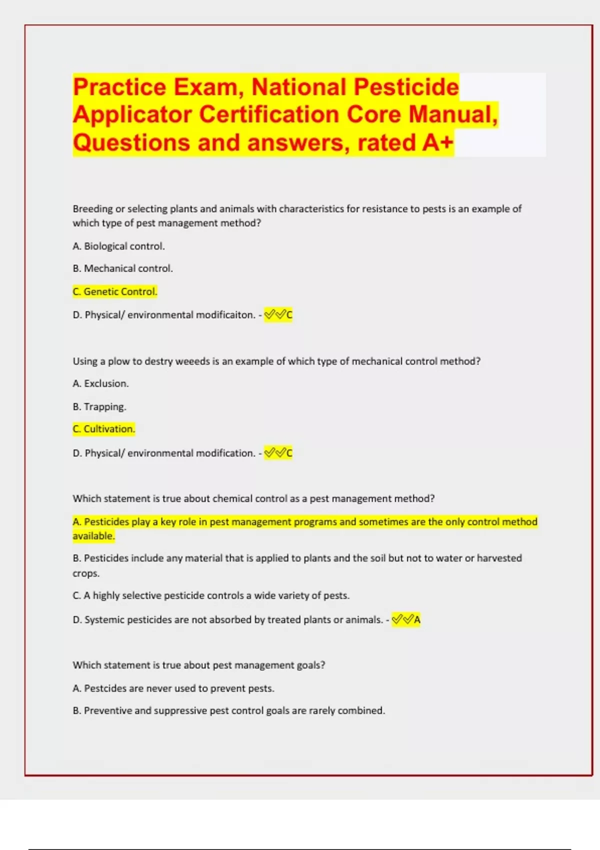 Practice Exam, National Pesticide Applicator Certification Core Manual, Questions and answers, rated A+ Breeding or selecting plants and animals with characteristics for resistance to pests is an example of which type of pest management method? A. Biological control. B. Mechanical control. C. Genetic Control. D. Physical/ environmental modificaiton. - C Using a plow to destry weeeds is an example of which type of mechanical control method? A. Exclusion. B. Trapping. C. Cultivation. D. Physical/ environmental modification. - C Which statement is true about chemical control as a pest management method? A. Pesticides play a key role in pest management programs and sometimes are the only control method available. B. Pesticides include any material that is applied to plants and the soil but not to water or harvested crops. C. A highly selective pesticide controls a wide variety of pests. D. Systemic pesticides are not absorbed by treated plants or animals. - A Which statement is true about pest management goals? A. Pestcides are never used to prevent pests. B. Preventive and suppressive pest control goals are rarely combined. C. Cultiviation and mowing of weeds are ways to prevent and suppress pest populations. D. Over large areas, eradication is a practical approach to pest cotnrol. - C Which term describes the pest population density that causes the losses equal to the cost of control measures? A. Economic threshold. B. Economic injury level. C. Action threshold. D. Pest threshold. - B Which would decrease the likelihood of pesticide resistance? A. Increasing label dosages. B. Using pesticides from the same class of chemicals. C. Applying the pesticide over a wide area. D. Using pesticides with multiple sites of toxicity in an organism. - D Which federal law requires employers to provide agricultural workers and pesticide handlers with protections against possible harm form pesticides? A. Federal Insecticide, Fungicide, and Rodenticide Act (FIFRA). B. Federal Food, Drug, and Cosmetic Act (FFDCA). C. Food Quality Protection Act (FQPA). D. Workers Protection Standard (WPS) - D What are the two main classifications of pesticides under FIFRA? A. Organic and inorganic. B. General-use and unclassified use. C. Regulated and unregulated. D. Unclassified use and restricted-use - D What is a tolerance as set by the EPA? A. The maximum amount of pesticides residue that may legally remain on or in a commodity at the time of harvest or slaughter. B. The maximum amount of pesticide residue that workers may be exposed to during the course of an average workday. C. The minimum amount of pesticide residue that may remain on a crop during the growing season. D. The minimum amount of pesticide residue that may be consumed by a 150-pound person on a yearly basis. - A Which of the following section sections under FIFRA could be used to alow the use of an unregistered pesticide to control an "emergency" pest