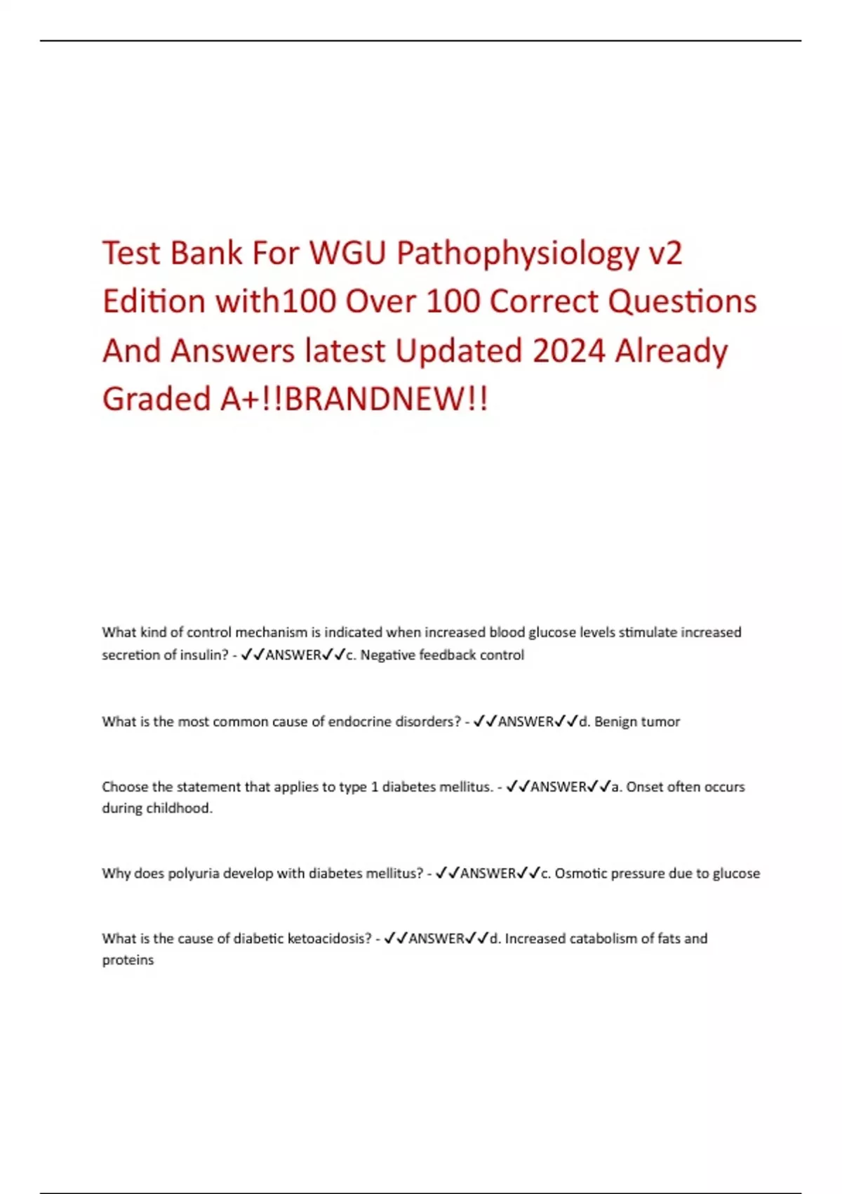 Test Bank For WGU Pathophysiology v2 Edition with100 Over 100 Correct Questions And Answers
