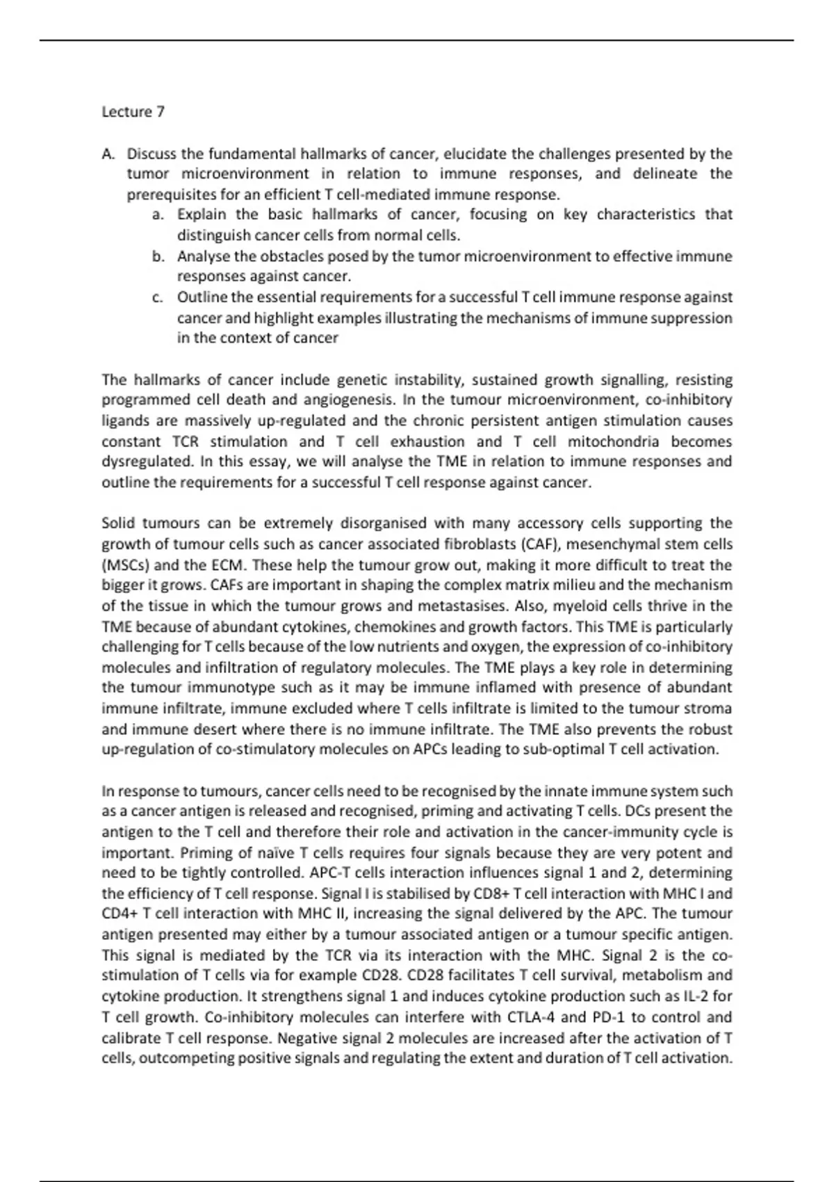 This essay covers all the content of lecture 7 of Immunology of Human Disease. The essay question is: Discuss the fundamental hallmarks of cancer, elucidate the challenges presented by the tumour microenvironment in relation to immune responses, and delineate the prerequisites for an efficient T cell-mediated immune response.