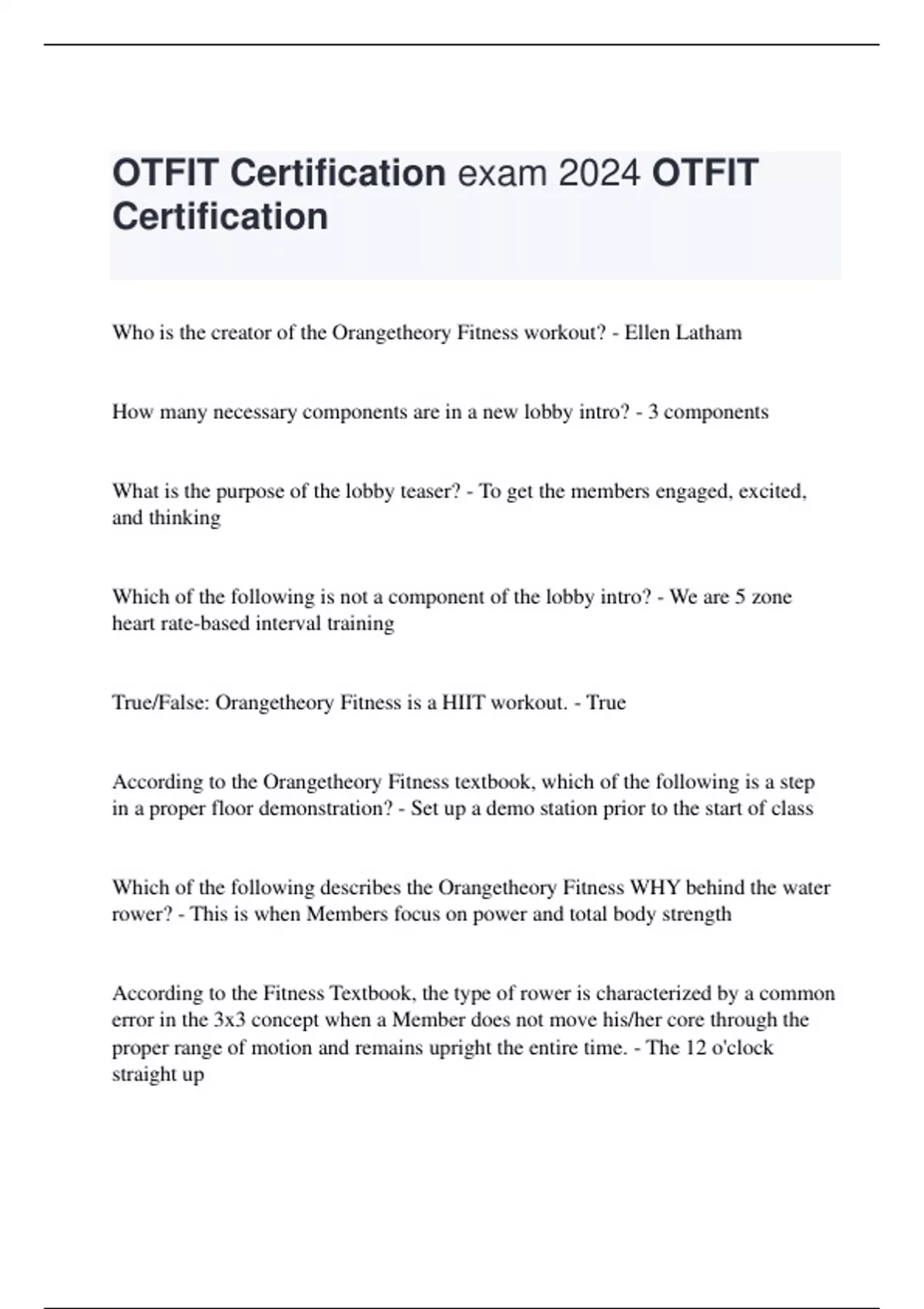 Who is the creator of the Orangetheory Fitness workout? - Ellen Latham How many necessary components are in a new lobby intro? - 3 components What is the purpose of the lobby teaser? - To get the members engaged, excited, and thinking Which of the following is not a component of the lobby intro? - We are 5 zone heart rate-based interval training True/False: Orangetheory Fitness is a HIIT workout. - True According to the Orangetheory Fitness textbook, which of the following is a step in a proper floor demonstration? - Set up a demo station prior to the start of class Which of the following describes the Orangetheory Fitness WHY behind the water rower? - This is when Members focus on power and total body strength According to the Fitness Textbook, the type of rower is characterized by a common error in the 3x3 concept when a Member does not move his/her core through the proper range of motion and remains upright the entire time. - The 12 o'clock straight up Which water rower intensity metric gets lower as power is increased? - Split time Which of the following is NOT an appropriate cue during Orangetheory Fitness workout? - Inspire your neighbor to tap that intensity up What is the primary job duty of a Fitness coach? - Delivering predesigned Orangetheory workouts True/False: It is acceptable to allow Members to hold a plank the final minute of a workout if it is not in the template. - False Which of the following floor modalities is primarily used for balance training and recruitment of smaller muscle fibers up and down the trunk and spine? - BOSU According to the Fitness Textbook, which cues assist in maintaining posture and avoiding lower back strain on the water rower? - "Chest open, pull the shoulder back and down while lifting out of the pelvis." In class, coaches utilize the word "options" to put a positive spin on this term commonly used in the fitness industry. - Modifications Which of the following is a component of the Orangetheory "Three C's" that is used when coaching? - Congratulate Which type of Member connections is the following "Great job on that past row!" - Acknowledgment Which type of Member connection is the following: "John, it looks like you're ready for the next set of dumbbells, but first, let's try the same weights at tempo." - Not a member connection Which type of Member connection is the following: "Susie fantastic job with those 8 lb weights! Soon you will be lifting your grandson over your shoulders, let's try 10lbs as the next step." - Emotional Connection Which type of Member connection is the following "Ken, I see that extra gear added on this hill, way to go!" - Personal Touch
