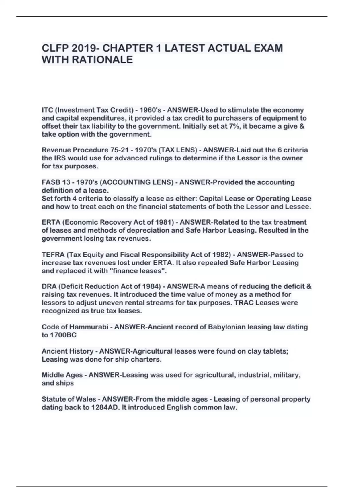 CLFP 2019- CHAPTER 1 LATEST ACTUAL EXAM WITH RATIONALE ITC (Investment Tax Credit) - 1960's - ANSWER-Used to stimulate the economy and capital expenditures, it provided a tax credit to purchasers of equipment to offset their tax liability to the government. Initially set at 7%, it became a give & take option with the government. Revenue Procedure 's (TAX LENS) - ANSWER-Laid out the 6 criteria the IRS would use for advanced rulings to determine if the Lessor is the owner for tax purposes. FASB 13 - 1970's (ACCOUNTING LENS) - ANSWER-Provided the accounting definition of a lease. Set forth 4 criteria to classify a lease as either: Capital Lease or Operating Lease and how to treat each on the financial statements of both the Lessor and Lessee. ERTA (Economic Recovery Act of 1981) - ANSWER-Related to the tax treatment of leases and methods of depreciation and Safe Harbor Leasing. Resulted in the government losing tax revenues. TEFRA (Tax Equity and Fiscal Responsibility Act of 1982) - ANSWER-Passed to increase tax revenues lost under ERTA. It also repealed Safe Harbor Leasing and replaced it with "finance leases". DRA (Deficit Reduction Act of 1984) - ANSWER-A means of reducing the deficit & raising tax revenues. It introduced the time value of money as a method for lessors to adjust uneven rental streams for tax purposes. TRAC Leases were recognized as true tax leases. Code of Hammurabi - ANSWER-Ancient record of Babylonian leasing law dating to 1700BC Ancient History - ANSWER-Agricultural leases were found on clay tablets; Leasing was done for ship charters. Middle Ages - ANSWER-Leasing was used for agricultural, industrial, military, and ships Statute of Wales - ANSWER-From the middle ages - Leasing of personal property dating back to 1284AD. It introduced English common law. Industrial Revolution - ANSWER-Leasing was used for horses, buggies, wagons and the railroad.