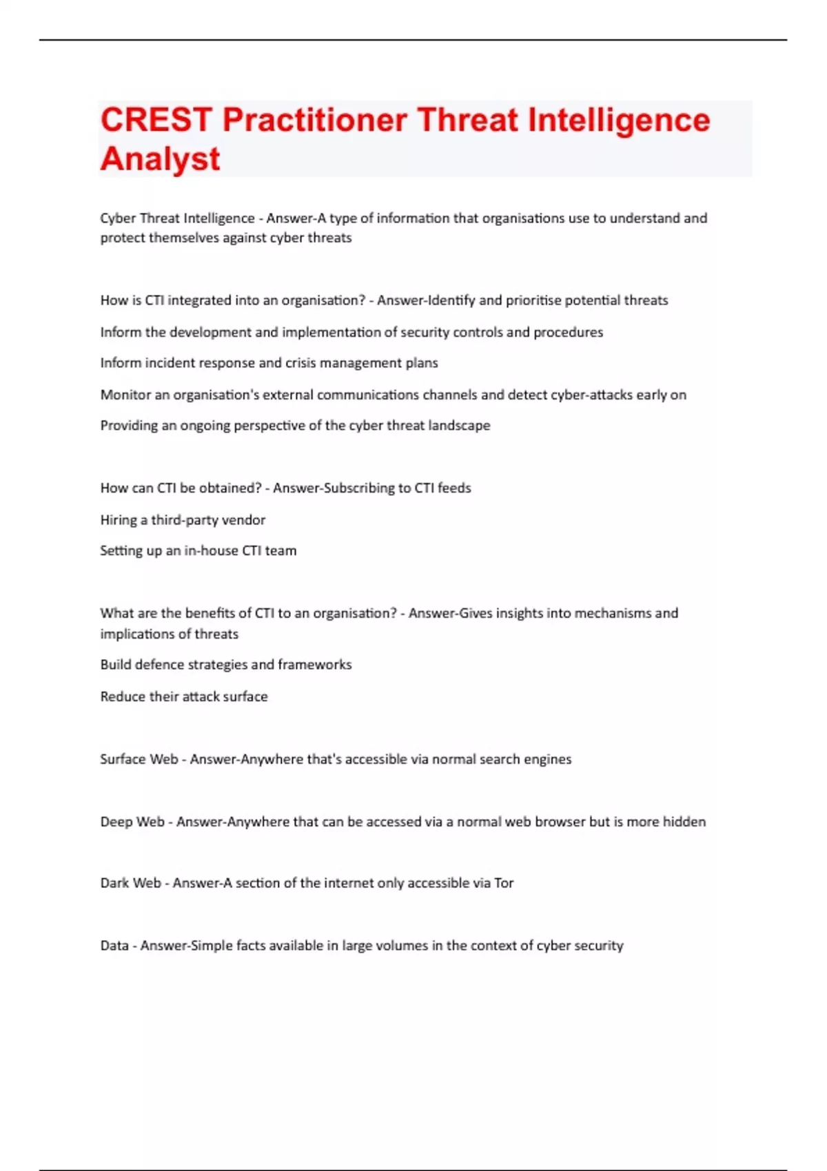 Cyber Threat Intelligence - Answer-A type of information that organisations use to understand and protect themselves against cyber threats How is CTI integrated into an organisation? - Answer-Identify and prioritise potential threats Inform the development and implementation of security controls and procedures Inform incident response and crisis management plans Monitor an organisation's external communications channels and detect cyber-attacks early on Providing an ongoing perspective of the cyber threat landscape How can CTI be obtained? - Answer-Subscribing to CTI feeds Hiring a third-party vendor Setting up an in-house CTI team What are the benefits of CTI to an organisation? - Answer-Gives insights into mechanisms and implications of threats Build defence strategies and frameworks Reduce their attack surface Surface Web - Answer-Anywhere that's accessible via normal search engines Deep Web - Answer-Anywhere that can be accessed via a normal web browser but is more hidden Dark Web - Answer-A section of the internet only accessible via Tor Data - Answer-Simple facts available in large volumes in the context of cyber securityInformation - Answer-Produced when data is collated to provide a useful output Intelligence - Answer-Comes from the processing and analysis of this information and can be used to inform decision making Collection - Answer-The process that obtains data Processing - Answer-The process that turns data into information Analysis - Answer-The process that turns information into intelligence Strategic Level - Answer-CTI at the board level for senior decision makers Operational Level - Answer-CTI for SOC operations and security controls applications, supporting the day to day operations of the business Tactical Level - Answer-CTI for technical investigations and threat hunts Black Hat Hacker - Answer-Conducts hacking activities without owner consent and with malicious intent Grey Hat Hacker - Answer-Conducts hacking activities without owner consent but usually stops short of malicious activity White Hat Hacker - Answer-Conducts hacking activities with the consent of the owner Threat Vector - Answer-A path or method via which a threat gains access to a computer or network Vulnerability - Answer-A flaw in the system (people, technology, business logic) that a threat can exploit to create an effect on the systemAttack Surface - Answer-The combined sum of the different points within an organisation that a malicious cyber actor can use to mount an attack
