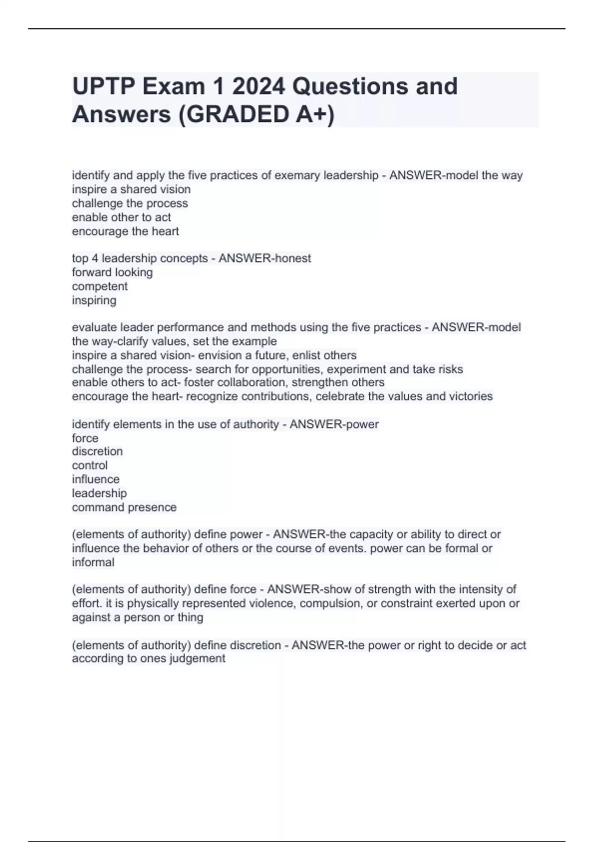 identify and apply the five practices of exemary leadership - ANSWER-model the way inspire a shared vision challenge the process enable other to act encourage the heart top 4 leadership concepts - ANSWER-honest forward looking competent inspiring evaluate leader performance and methods using the five practices - ANSWER-model the way-clarify values, set the example inspire a shared vision- envision a future, enlist others challenge the process- search for opportunities, experiment and take risks enable others to act- foster collaboration, strengthen others encourage the heart- recognize contributions, celebrate the values and victories identify elements in the use of authority - ANSWER-power force discretion control influence leadership command presence (elements of authority) define power - ANSWER-the capacity or ability to direct or influence the behavior of others or the course of events. power can be formal or informal (elements of authority) define force - ANSWER-show of strength with the intensity of effort. it is physically represented violence, compulsion, or constraint exerted upon or against a person or thing (elements of authority) define discretion - ANSWER-the power or right to decide or act according to ones judgement (elements of authority) define control - ANSWER-to exercise restraint or direction over dominate. the authority given to all branches of law enforcement offices in our society comes under the direction and control of the constitution of the United states (elements of authority) define influence - ANSWER-and action exerted by one thing or person over another (elements of authority) define leadership - ANSWER-ones ability to get others willingly follow. (elem
