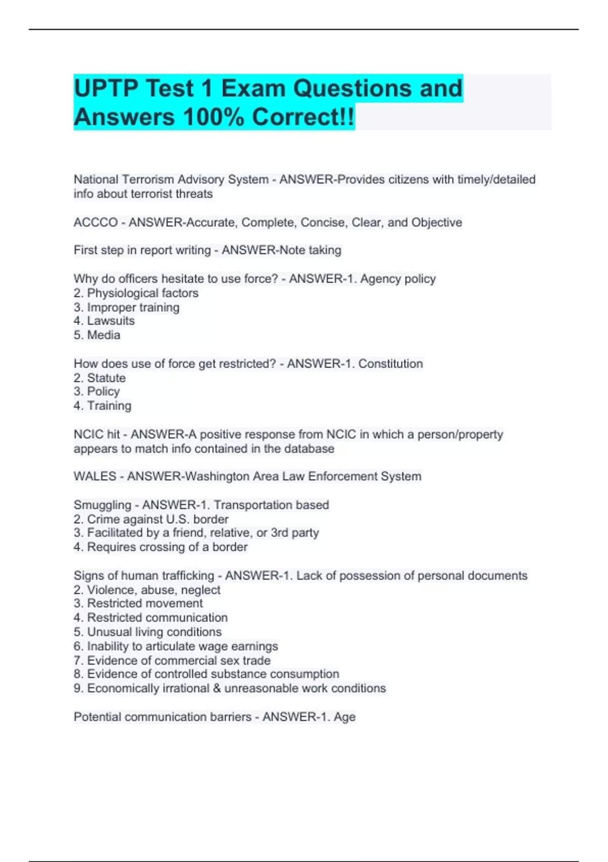 National Terrorism Advisory System - ANSWER-Provides citizens with timely/detailed info about terrorist threats ACCCO - ANSWER-Accurate, Complete, Concise, Clear, and Objective First step in report writing - ANSWER-Note taking Why do officers hesitate to use force? - ANSWER-1. Agency policy 2. Physiological factors 3. Improper training 4. Lawsuits 5. Media How does use of force get restricted? - ANSWER-1. Constitution 2. Statute 3. Policy 4. Training NCIC hit - ANSWER-A positive response from NCIC in which a person/property appears to match info contained in the database WALES - ANSWER-Washington Area Law Enforcement System Smuggling - ANSWER-1. Transportation based 2. Crime against U.S. border 3. Facilitated by a friend, relative, or 3rd party 4. Requires crossing of a border Signs of human trafficking - ANSWER-1. Lack of possession of personal documents 2. Violence