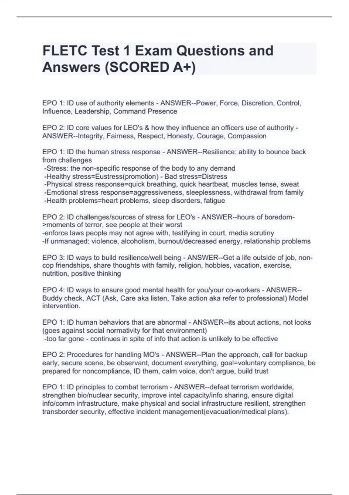 EPO 1: ID use of authority elements - ANSWER--Power, Force, Discretion, Control, Influence, Leadership, Command Presence EPO 2: ID core values for LEO's & how they influence an officers use of authority - ANSWER--Integrity, Fairness, Respect, Honesty, Courage, Compassion EPO 1: ID the human stress response - ANSWER--Resilience: ability to bounce back from challenges -Stress: the non-specific response of the body to any demand -Healthy stress=Eustress(promotion) - Bad stress=Distress -Physical stress response=quick breathing, quick heartbeat, muscles tense, sweat -Emotional stress response=aggressiveness, sleeplessness, withdrawal from family -Health problems=heart problems, sleep disorders, fatigue EPO 2: ID challenges/sources of stress for LEO's - ANSWER--hours of boredom->moments of terror, see people at their worst -enforce laws people may not agree with, testifying in court, media scrutiny -If unmanaged: violence, alcoholism, burnout/decreased energy, relationship problems EPO 3: ID ways to build resilience/well being - ANSWER--Get a life outside of job, non-cop friendships, share thoughts with family, religion, hobbies, vacation, exercise, nutrition, positive thinking EPO 4: ID ways to ensure good mental health for you/your co-workers - ANSWER--Buddy check, ACT (Ask, Care aka listen, Take action aka refer to professional) Model intervention. EPO 1: ID human behaviors that are abnormal - ANSWER--its about actions, not looks (goes against social normativity for that environment) -too far gone - continues in spite of info that action is unlikely to be effective EPO 2: Procedures for handling MO's - ANSWER--Plan the approach, call for backup early, secure scene, be observant, document everything, goal=voluntary compliance, be prepared for noncompliance, ID them, calm voice, don't argue, build trust EPO 1: ID principles to combat terrorism - ANSWER--defeat terrorism worldwide, strengthen bio/nuclear security, improve intel capacity/info sharing, ensure digital info/comm infrastructure, make physical and social infrastructure resilient, strengthen transborder security, effective incident management(evacuation/medical plans). EPO 2: ID 4 failures by 9/11 commission - ANSWER-Imagination (CTC didn't see how an aircraft could be a weapon), Policy (